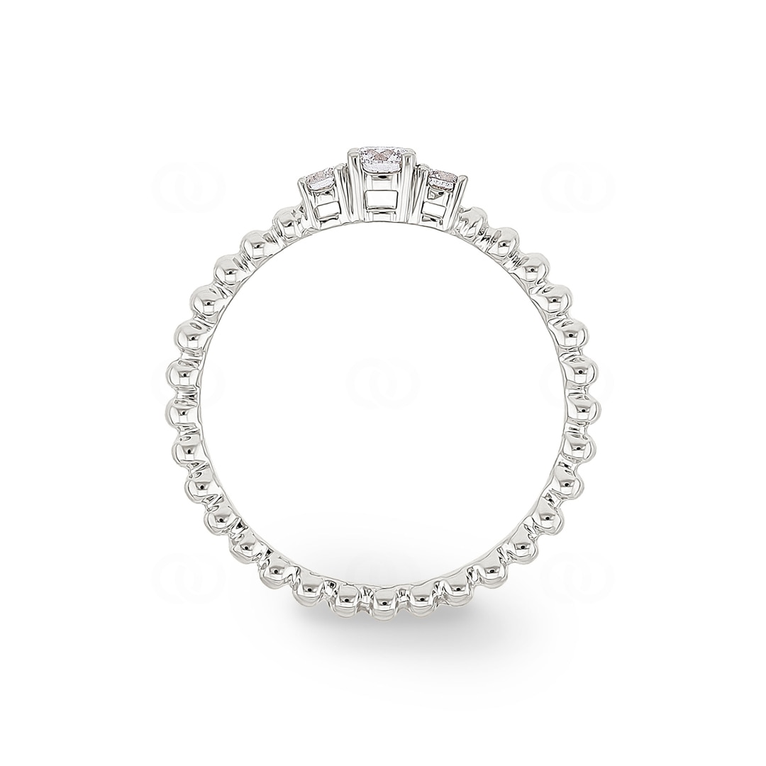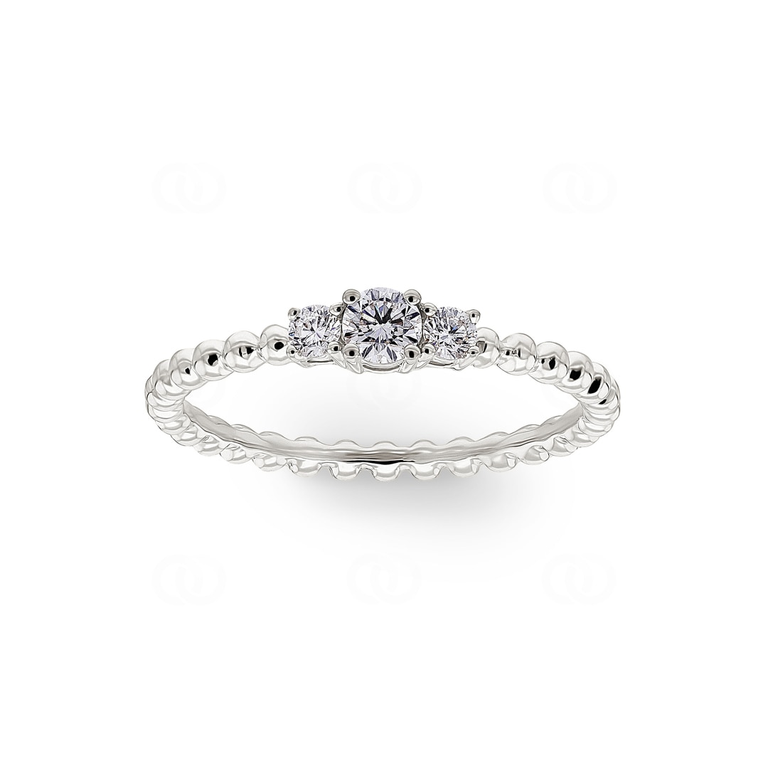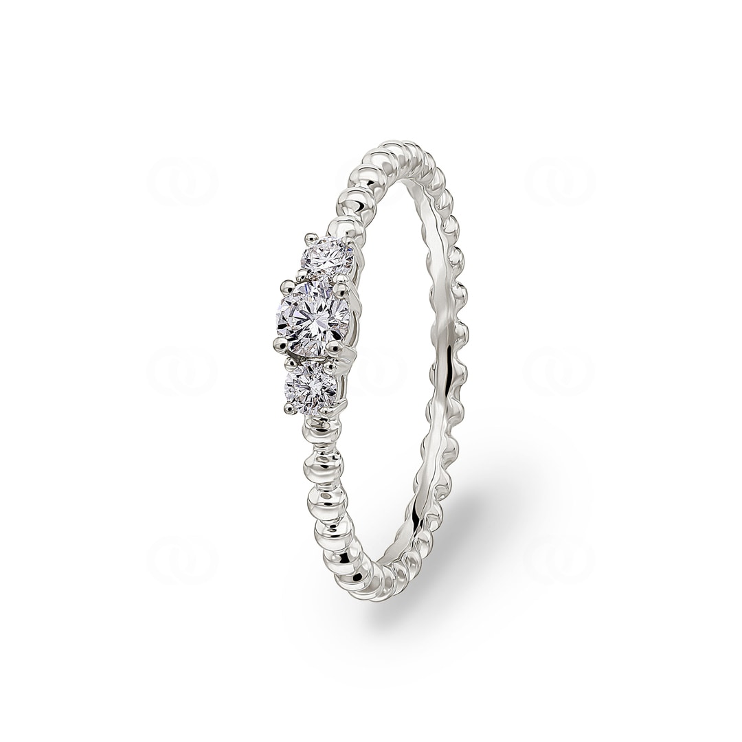 Die Ringschiene aus 18 Karat Weissgold besticht durch ihre feine Kugelstruktur, die dem Ring eine besondere Haptik und eine verspielte Eleganz verleiht. Im Zentrum dieses modernen Designs thront das unvergängliche Symbol für Vergangenheit, Gegenwart und Zukunft: drei brillant geschliffene Diamanten mit insgesamt 0.24 Karat.