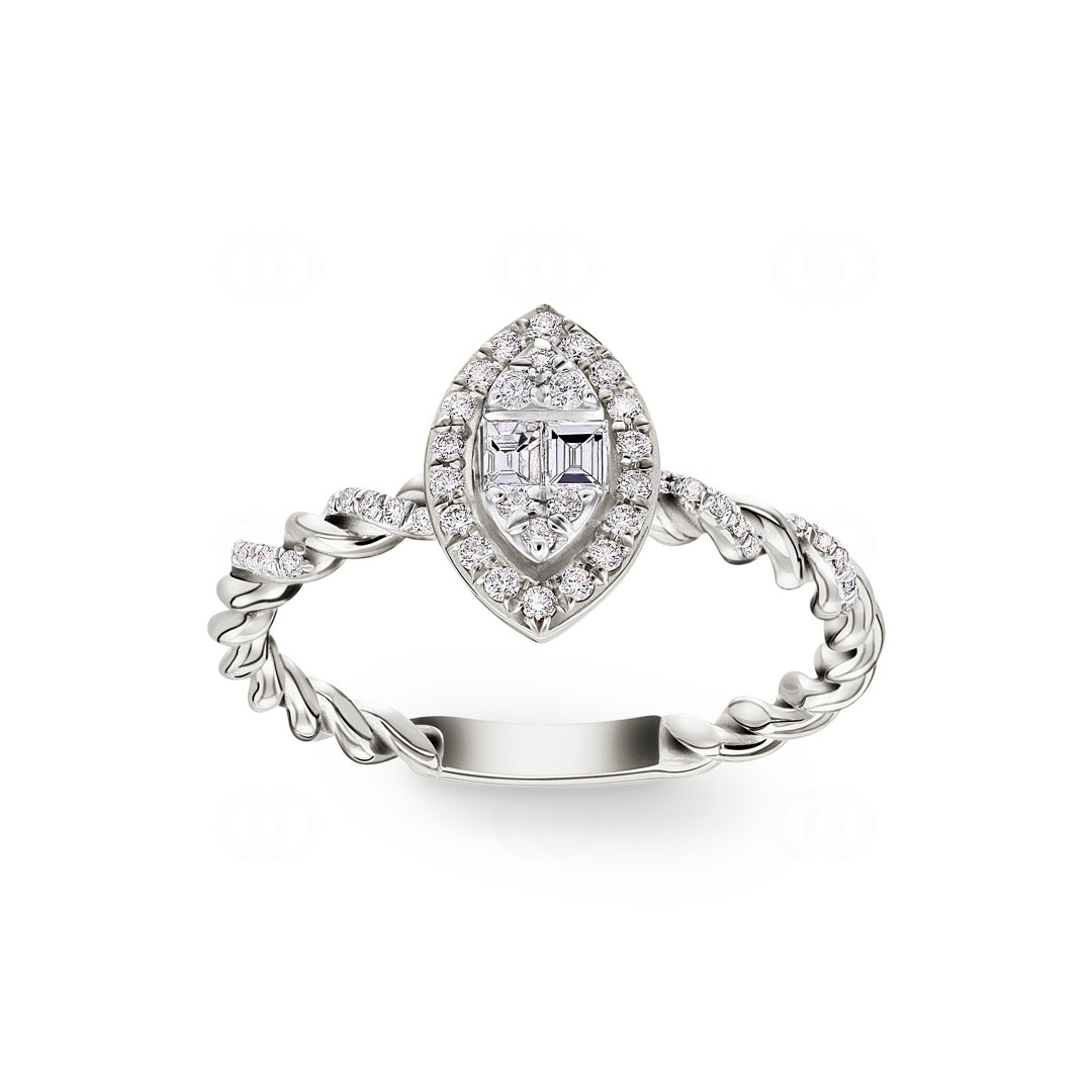 Tauche ein in die faszinierende Welt unseres Diamantrings aus strahlendem 18 Karat Weissgold. Die verdrehte Ringschiene, kunstvoll mit vier Strängen funkelnder Diamanten besetzt, führt zu einem Höhepunkt: einem majestätischen Element in Navetten-Form. Hier verschmilzt eine harmonische Symphonie aus Baguette-Diamanten und Brillanten zu einem magischen Ensemble, das die Herzen berührt und Emotionen weckt. Ein Ring, der nicht nur Geschichten erzählt, sondern sie auch mit jedem Blick aufs Neue zum Leben erweckt.