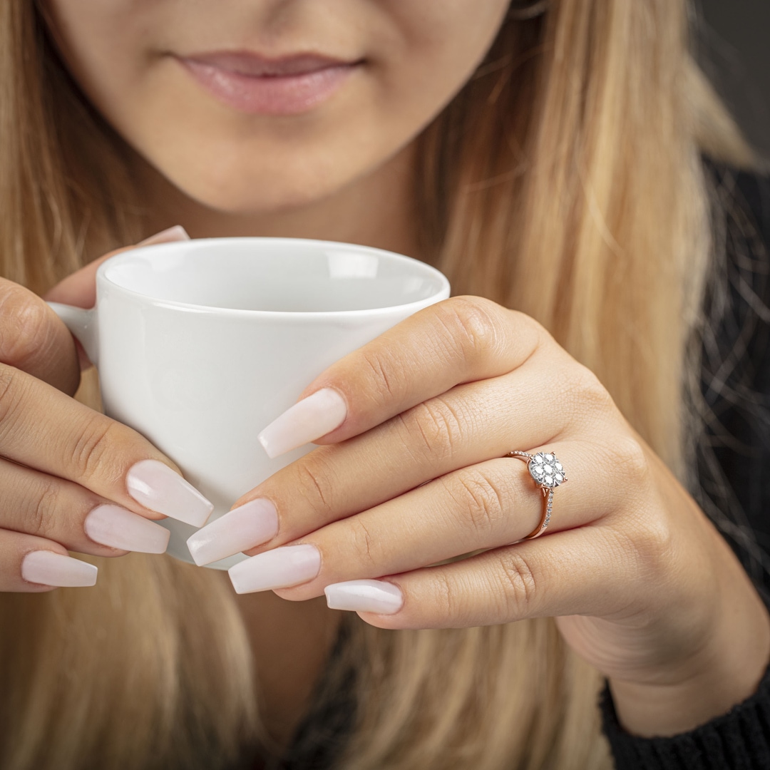 Wie eine blühende Blume erheben sich im Zentrum von diesem Ring die Brillanten, welche spektakulär glänzend und romantisch funkelnd für edle Eleganz sorgen. Begleitet werden sie von einer mit 14 Diamanten besetzten Ringschiene, die mit ihnen um die Wette strahlen und somit die aussergewöhnliche Eleganz von diesem Diamantring unterstreichen. Der Verlobungsring verkörpert die pure Essenz der Liebe. Er steht für den Entschluss, gemeinsam durchs Leben zu gehen, und für die Gefühle, die ein Paar verbinden. Doch keine Sorge, auch ohne bevorstehende Hochzeit ist dieser Ring ein wahrer Blickfang. Mit dem strahlenden Funkeln der Diamanten und seinem zeitlosen Design lässt sich dieser Ring perfekt mit anderen Ringen kombinieren.
