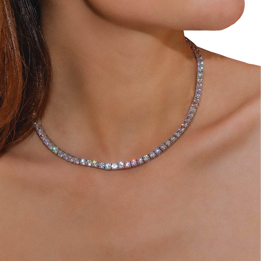 Dieses Tenniscollier besticht durch edlen Glanz, bezauberndes Funkeln, zeitloses Design und präzise Verarbeitung. Es ist durchgängig mit Zirkonia Steinen besetzt, welche einzeln in einer 4-Griff Fassung gefasst sind. Gefertigt wurde das 3mm breite Tenniscollier aus hochwertigem Messing und ist mit Weissgold vergoldet. Der praktische Verschluss ermöglicht ein schnelles und sicheres Schliessen. Die einzigartige Form und Zusammensetzung der Glieder macht dieses Collier optisch so besonders: Es ist vielseitig kombinierbar und rundet sowohl sportliche wie auch klassisch-elegante Outfits perfekt ab.