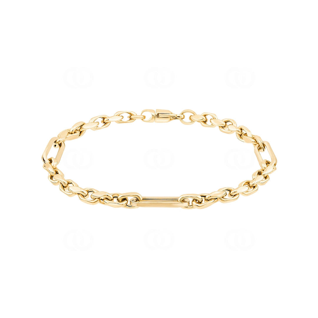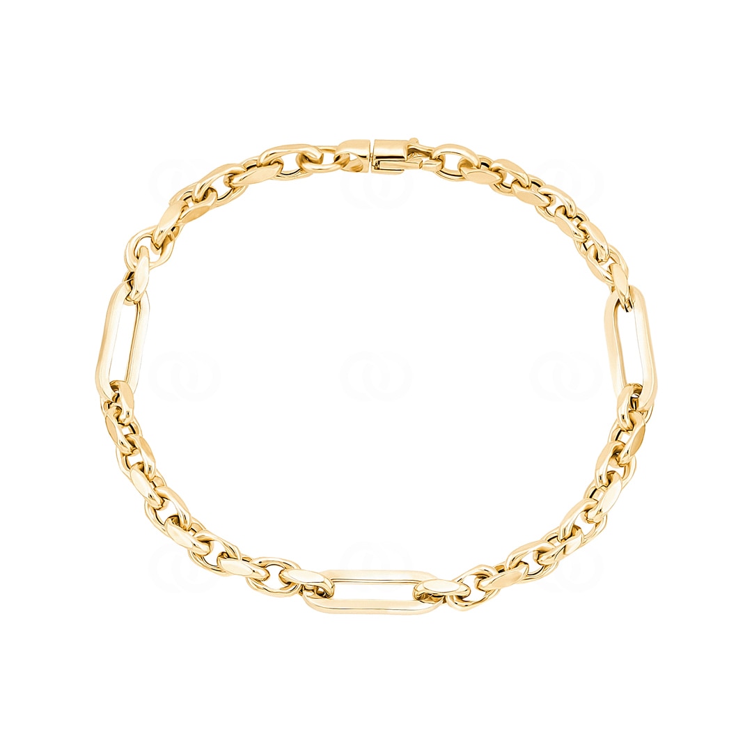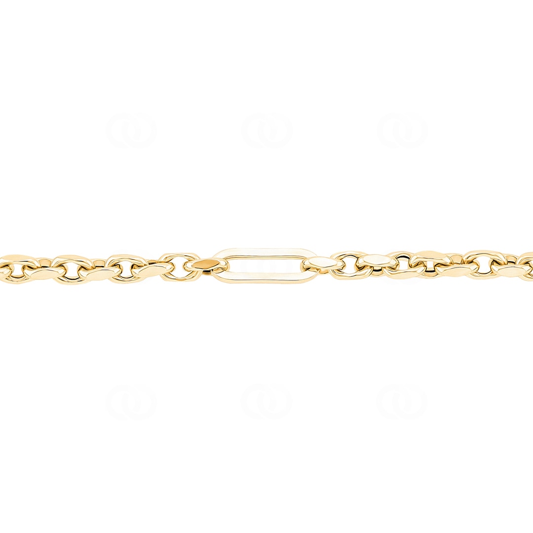 Dieses Fantasiearmband aus 18 Karat Gelbgold verführt mit einer atemberaubenden Kombination aus Eleganz und Kreativität. Die geschliffenen Ankerglieder, unterbrochen von langen, ovalen Gliedern, schaffen einen faszinierenden Kontrast, der jedes Licht einfangen und reflektieren wird. Mit einer Breite von 5,5 mm liegt es sanft am Handgelenk, während die halbmassive Verarbeitung für ein aussergewöhnlich angenehmes Tragegefühl sorgt. Der Karabinerverschluss garantiert Sicherheit und Komfort. Ein Armband, das mit jeder Bewegung Geschichten erzählt und unvergessliche Akzente setzt.
