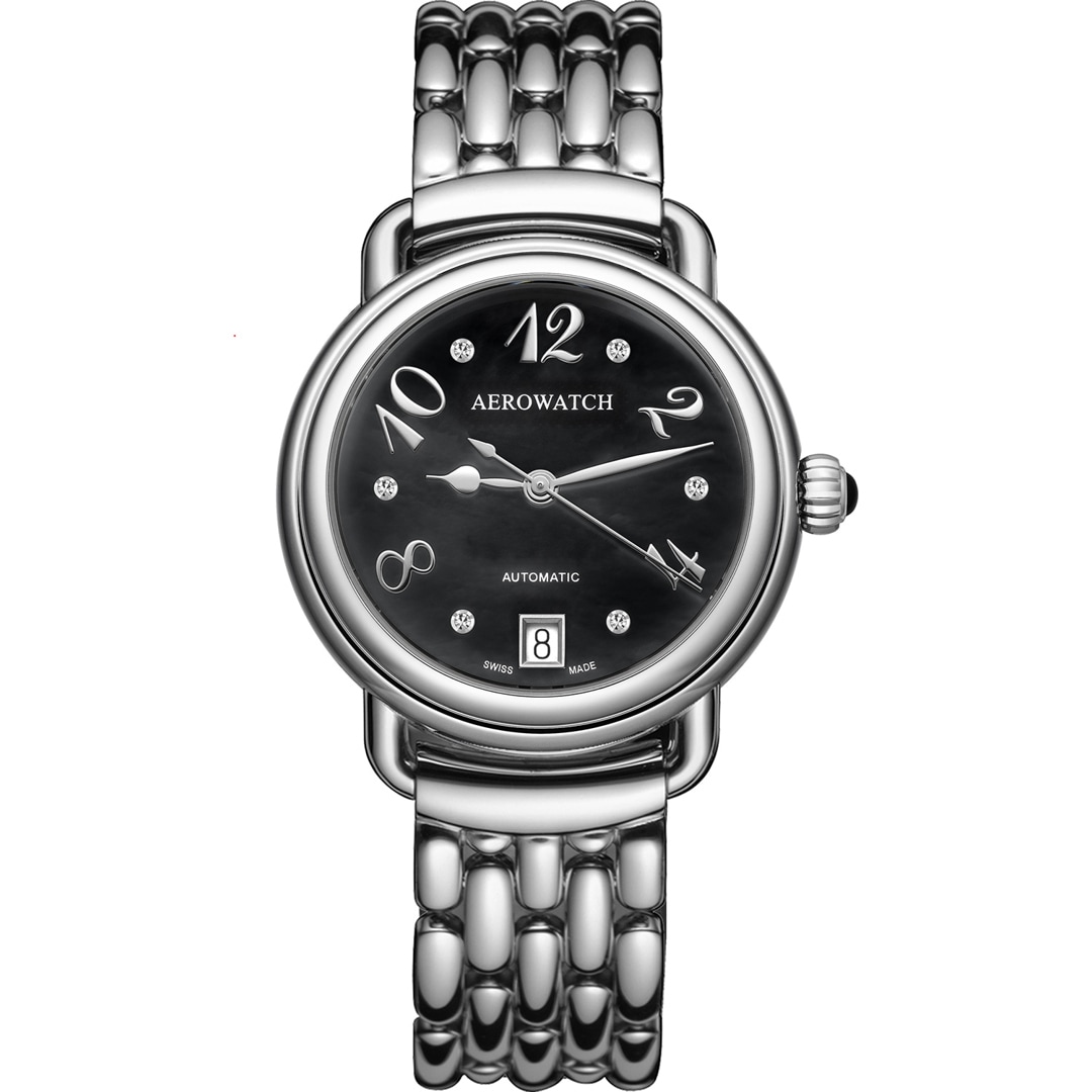 Zum sanften, runden Stahlgehäuse passend hat Aerowatch die Zwiebelkrone mit einem schwarzen Stein besetzt, der in Einklang zum schwarzen Perlmuttzifferblatt mit Diamantindizes steht. Der irisierende Schein, der durch die Lichteinwirkung entsteht, verleiht jeder Uhr eine eigene Identität. Prägend für eine zeitlose Eleganz sind die rhodinierten Feuille-Zeiger, die das ausgewogene Design der 1942 vollenden. Die klassische Damenuhr von Aerowatch ist mit einem Schweizer Automatikwerk mit Datumsanzeige ausgestattet und einem edlen Edelstahlband mit Faltschliesse versehen.