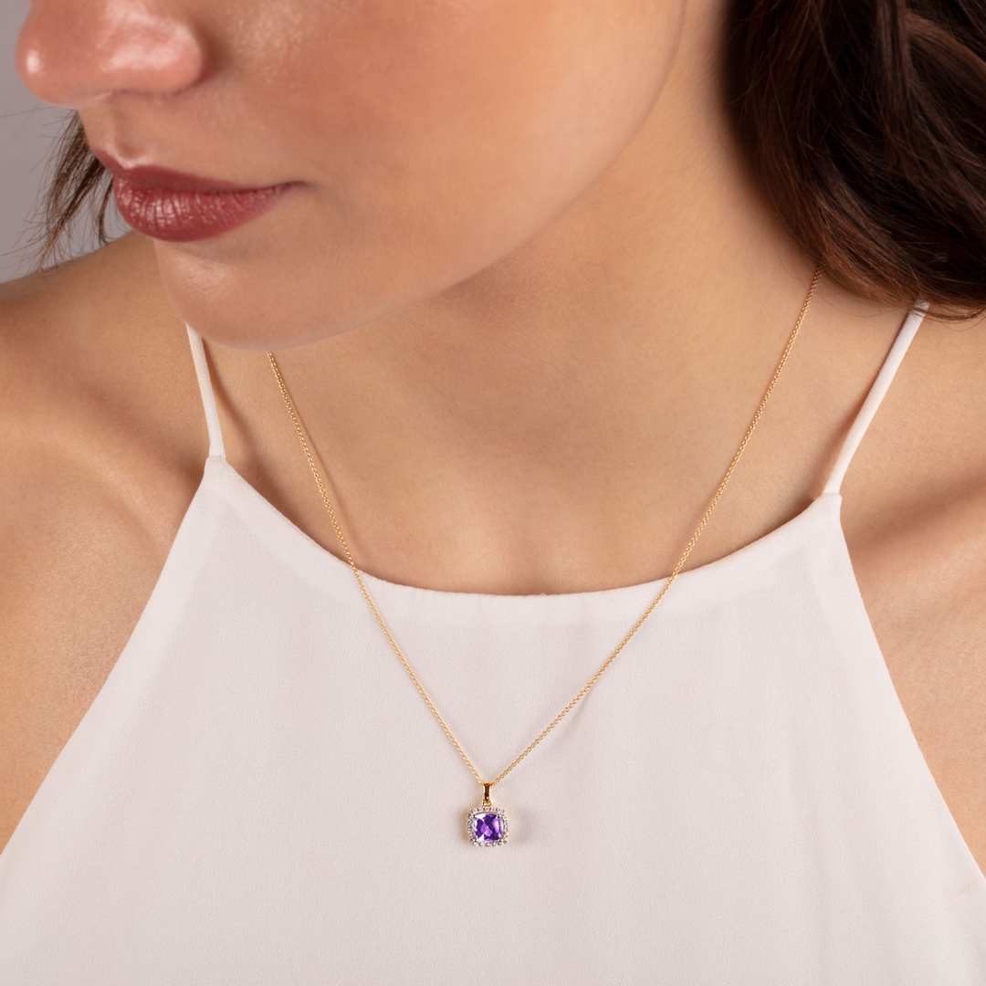 An diesen glamourösen Anhänger werden Sie sofort Ihr Herz verlieren! Das feine Schmuckstück aus 750/18 K Gelbgold ist mit 20 funkelnden Diamanten und einem bezaubernden Amethyst im Kissenschliff besetzt, wodurch dieser Anhänger eine exklusive, luxuriöse Ausstrahlung erhält. Die hochwertigen Materialien und das Design mit viel Liebe zum Detail lassen keine Wünsche offen. Der Anhänger passt perfekt zu jeder feinen Goldkette und lässt seine Besitzerin auf natürliche Weise strahlen.
