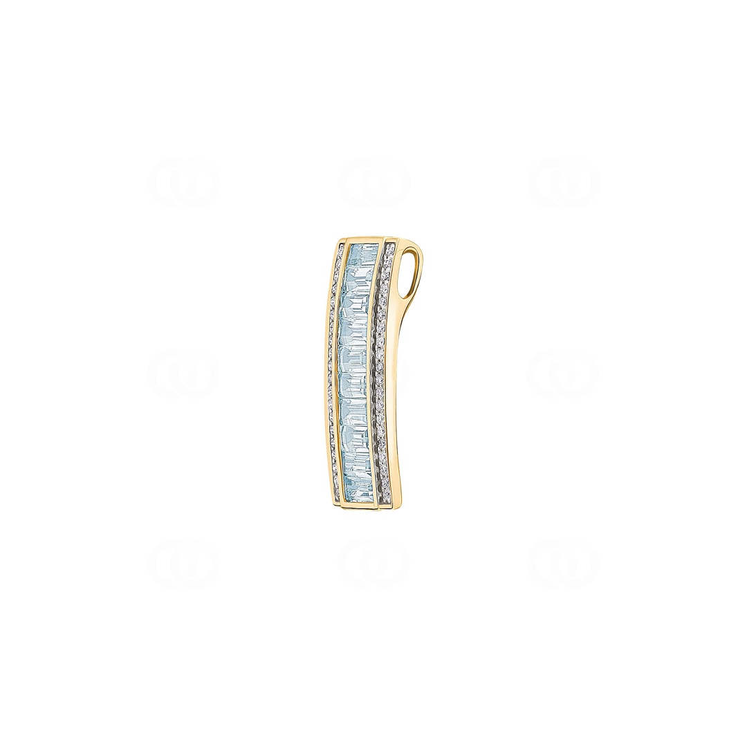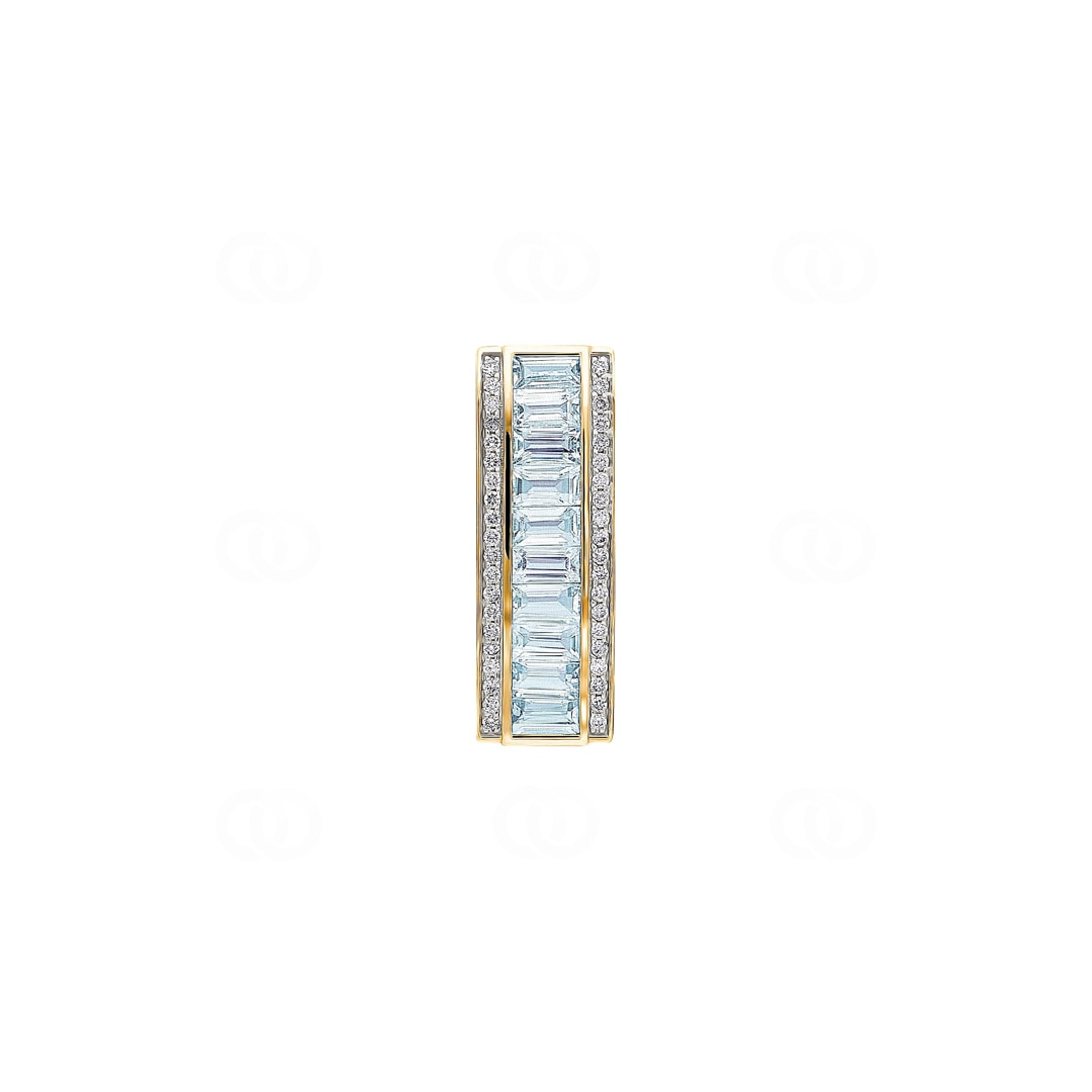 Dieser Anhänger aus 18 Karat Gelbgold ist eine Hommage an die geometrische Klarheit und die luxuriöse Ästhetik des Art-déco-Stils. Sein Design besticht durch eine klare, architektonische Linienführung und ein faszinierendes Zusammenspiel verschiedener Edelsteinschliffe. Im Zentrum verläuft eine durchgehende Reihe aus zehn Aquamarinen im eleganten Baguetteschliff. Ihr klares, eisblaues Leuchten wird von zwei Bändern aus insgesamt 40 Brillanten eingerahmt, die für ein intensives, kontrastreiches Funkeln sorgen. Die auf der Rückseite integrierte Öse bewahrt die puristische, rechteckige Form des Schmuckstücks.
