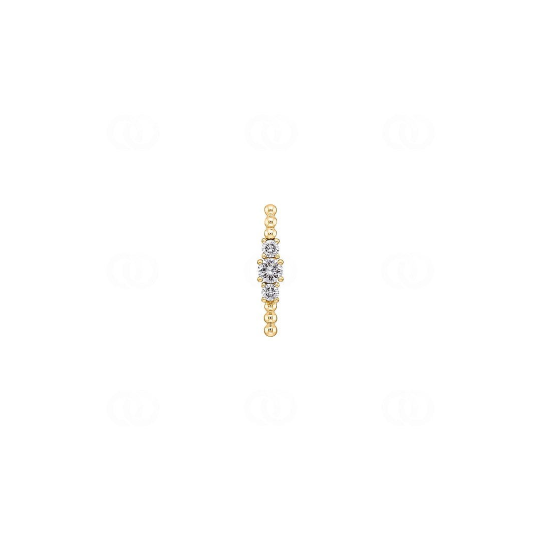 Auf diesem goldenen Pfad leuchten drei brillante Diamanten (total 0.24 ct) – strahlende Meilensteine, die für das Gestern, das Heute und das Morgen stehen. Dank der raffinierten, auf der Rückseite verborgenen Öse scheint diese kostbare Zeitlinie schwerelos auf der Haut zu schweben und lenkt den Blick ganz auf ihre symbolische Schönheit.