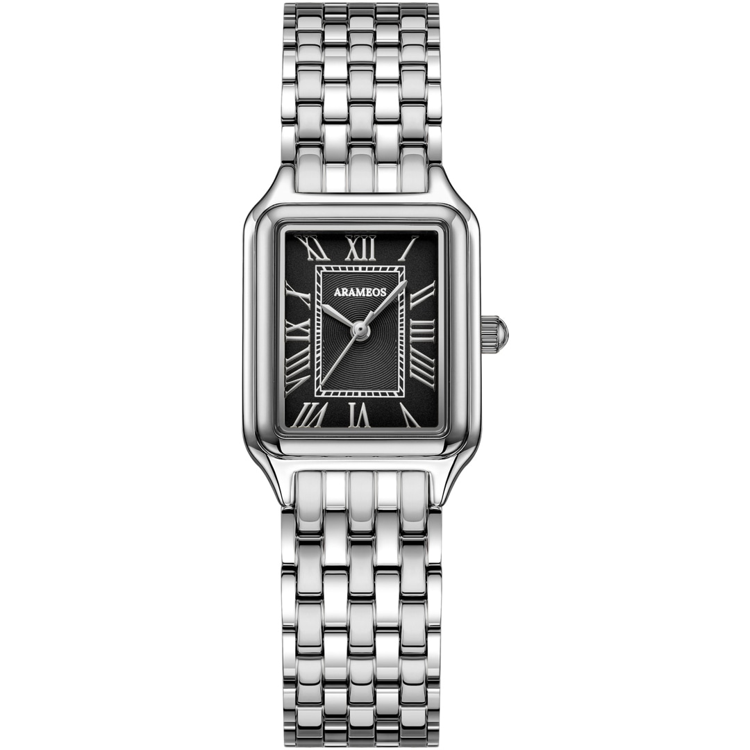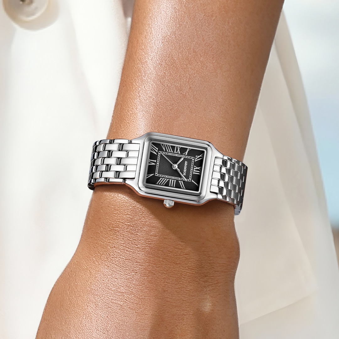 Das eckige Edelstahlgehäuse besticht durch seine fein polierten Oberflächen und umschliesst ein tiefschwarzes Zifferblatt. Die silberfarbenen römischen Ziffern heben sich kontrastreich ab und verleihen der Uhr eine fast architektonische Tiefe. Für eine makellose Sicht sorgt das verbaute Saphirglas mit AR-Beschichtung. Diese hochwertige Entspiegelung minimiert Reflexionen und macht das Ablesen der Zeit selbst bei hellem Tageslicht zu einem Vergnügen.