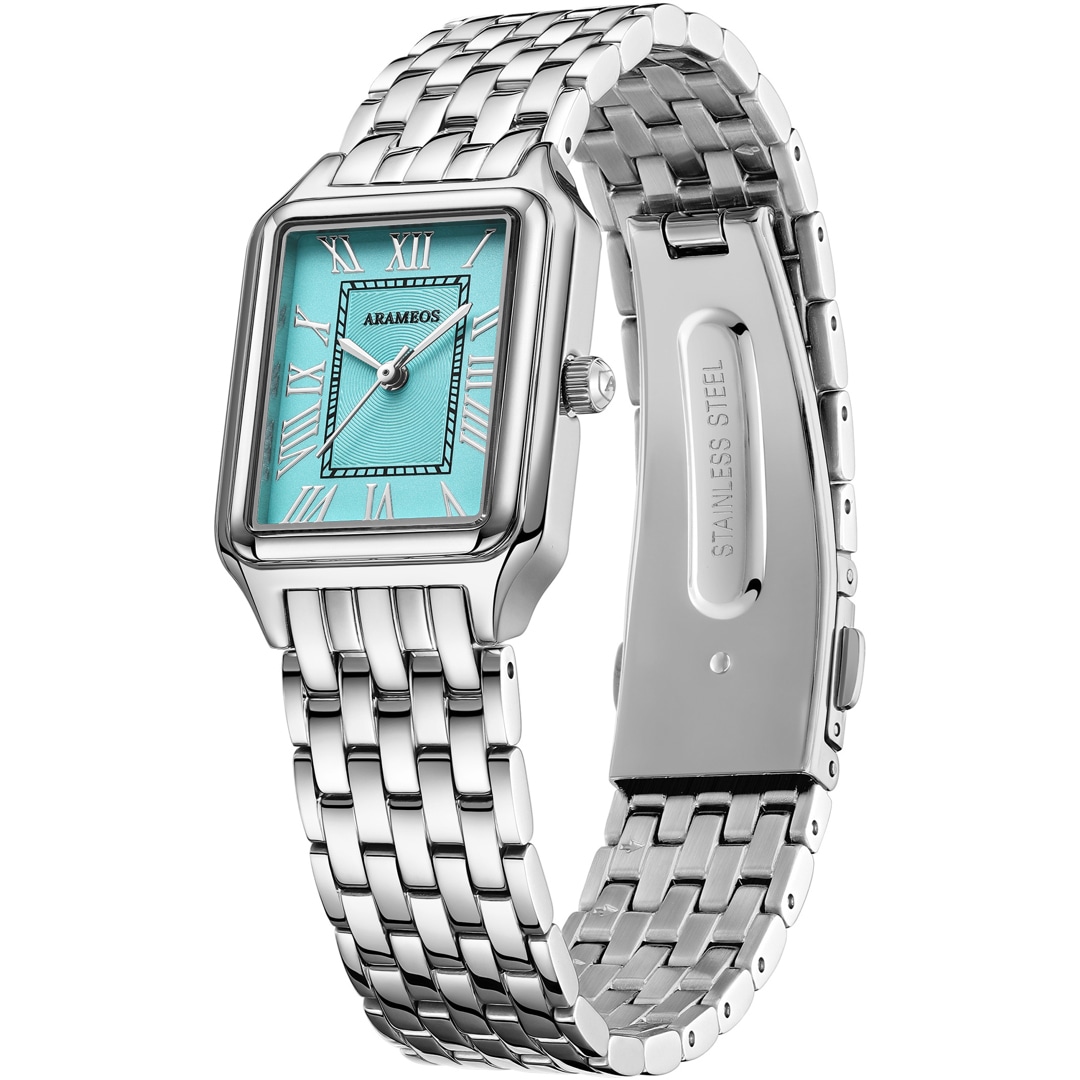 Das eckige Edelstahlgehäuse bildet den Rahmen für ein Zifferblatt in einem sanften Hellblau, das durch die filigranen römischen Ziffern eine klassische Tiefe erhält. Damit diese besondere Farbe jederzeit brillant zur Geltung kommt, wird sie von Saphirglas mit AR-Beschichtung geschützt. Diese Entspiegelung sorgt dafür, dass störende Lichtreflexe minimiert werden und der Blick auf die Zeit stets ungetrübt bleibt.