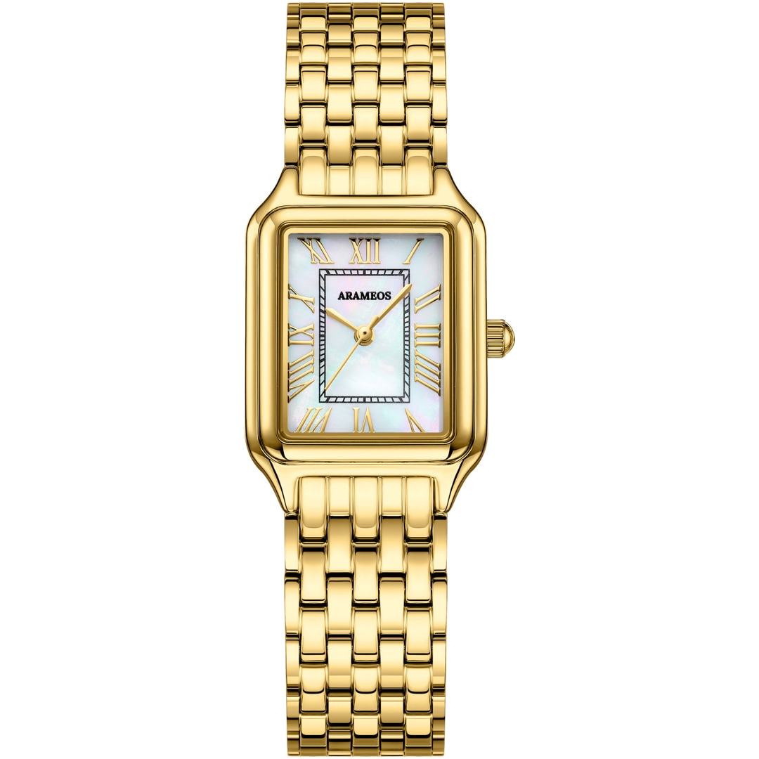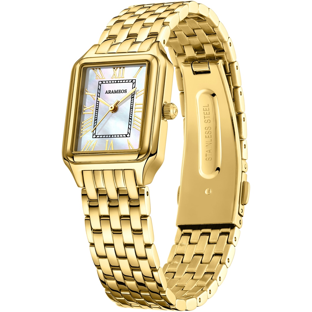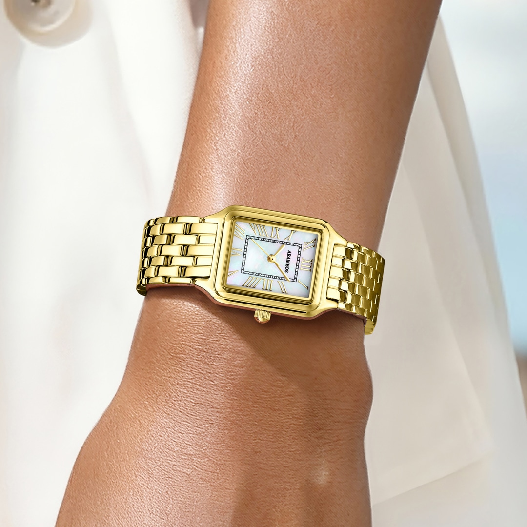 Das eckige Edelstahlgehäuse sowie das massive Edelstahlarmband sind mit einer edlen IP-Vergoldung veredelt, die der Uhr eine warme, luxuriöse Ausstrahlung verleiht. Dank der massiven Bauweise des Armbands fühlt sich der Zeitmesser wunderbar wertig am Handgelenk an. Ob als glanzvoller Akzent zum Abendoutfit oder als tägliches Lieblingsstück – die Luna Chic ist ein Schmuckstück, das die Zeit nicht nur misst, sondern sie verschönert.