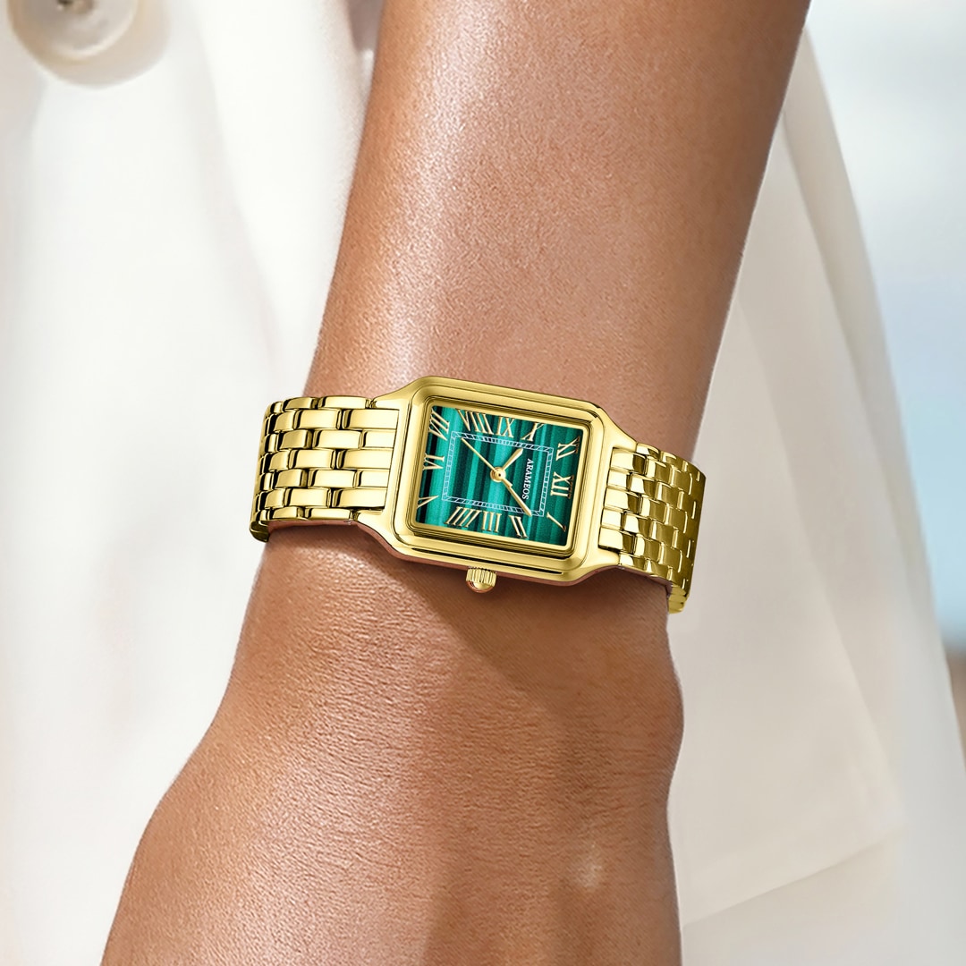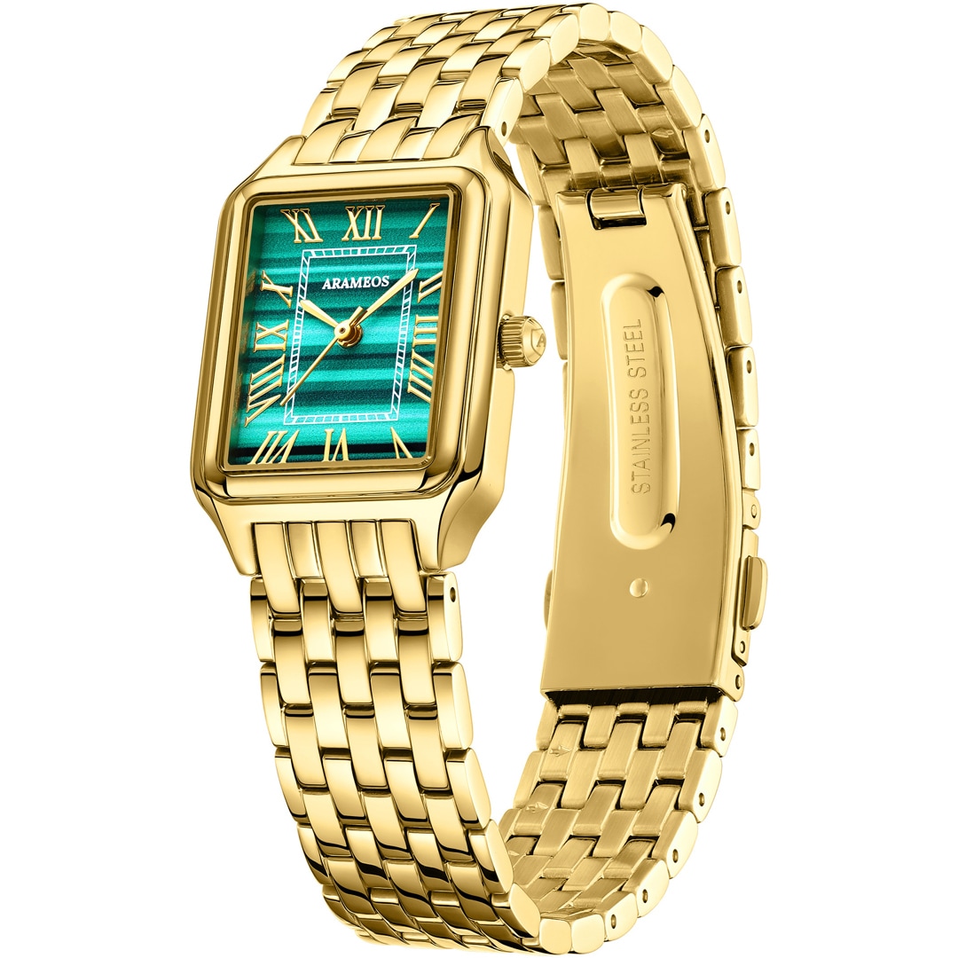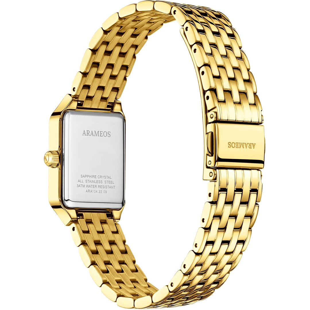 Das eckige Edelstahlgehäuse und das massive Edelstahlarmband sind mit einer beständigen IP-Vergoldung veredelt. Diese Kombination verleiht der Uhr eine warme, luxuriöse Präsenz und eine spürbare Wertigkeit am Handgelenk. Die Luna Chic ist nicht nur ein Instrument zur Zeitmessung, sondern ein charakterstarkes Schmuckstück, das Souveränität und Stilbewusstsein ausstrahlt.