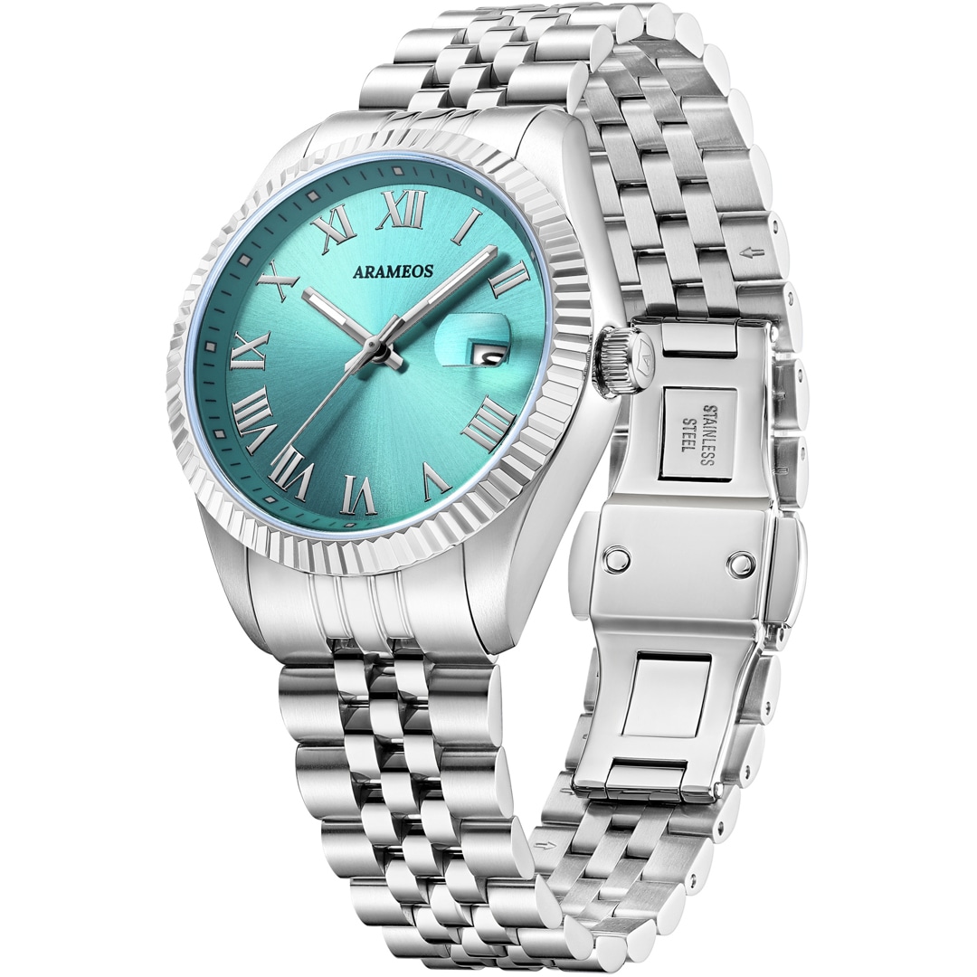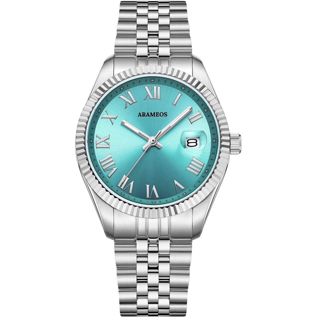 Die Arameos Prestige Elegance ist weit mehr als ein Zeitmesser – sie ist ein Accessoire, das durch Klarheit und Detailtiefe besticht. Das markante hellblaue Zifferblatt mit Sonnenschliff verleiht der Uhr eine lebendige Optik, während die klassischen römischen Ziffern für zeitlose Seriosität sorgen. Eingebettet in ein robustes 36 mm Edelstahlgehäuse, bildet die fein geriffelte Lünette einen harmonischen Rahmen, der Qualität und Design perfekt vereint.