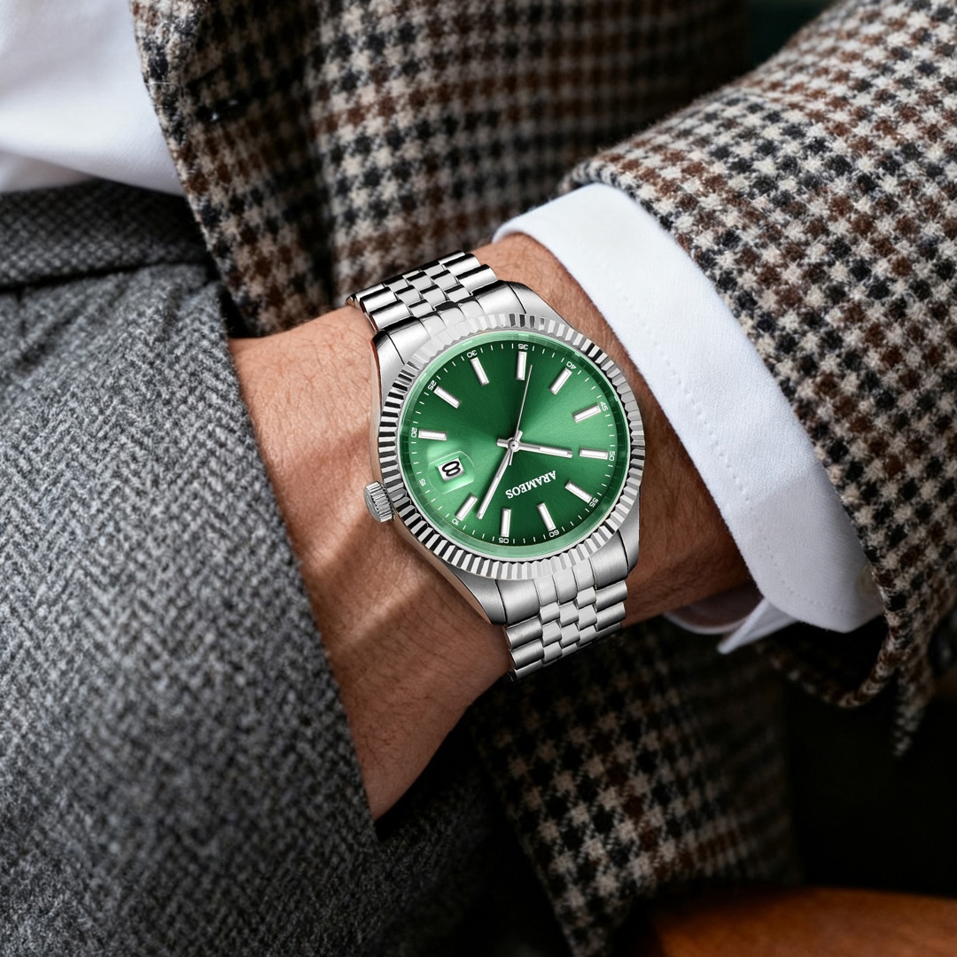 Die Arameos Prestige Elegance ist ein Zeitmesser für Individualisten, die Wert auf Charakter und handwerkliche Exzellenz legen. Das Herzstück dieser Uhr ist das grüne Zifferblatt, das durch einen aufwendigen Sonnenschliff eine faszinierende optische Tiefe erhält. Im Zusammenspiel mit den puristischen Strich-Indizes entsteht ein moderner, aufgeräumter Look, der trotz seiner Farbgewalt zeitlos bleibt. Das 41 mm Edelstahlgehäuse verleiht der Uhr eine souveräne Statur, während die präzise geriffelte Lünette für feine Lichtreflexe sorgt.
