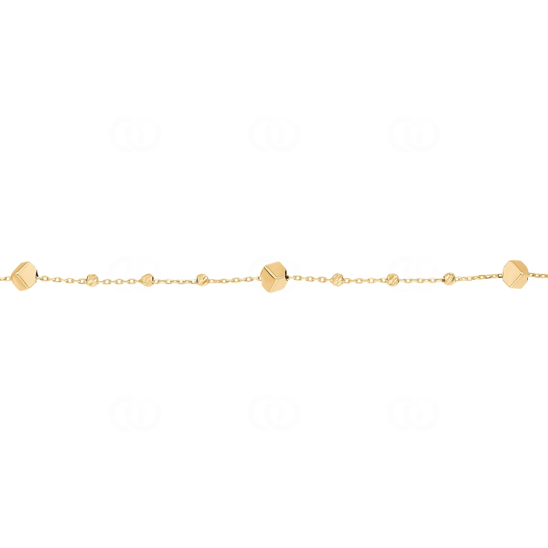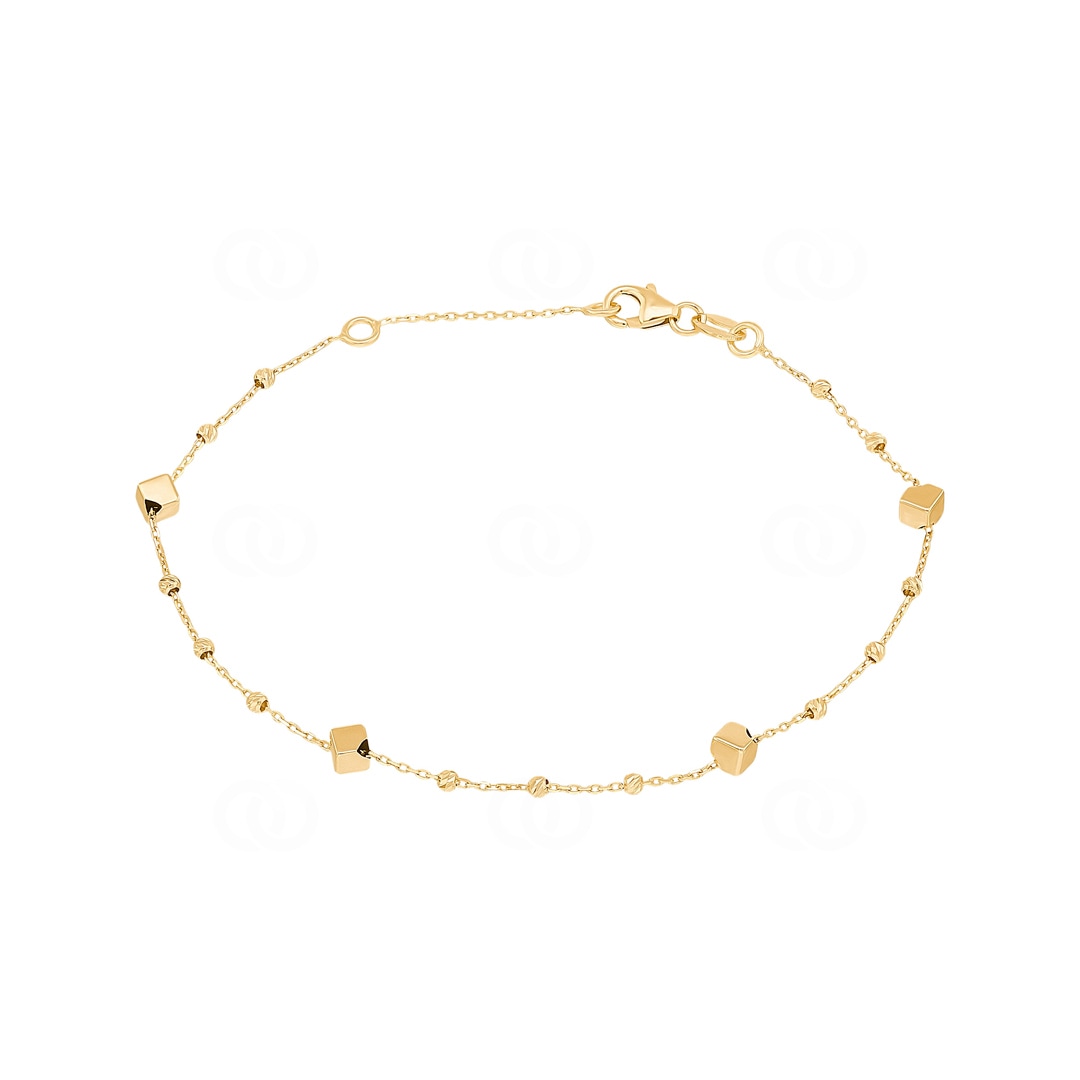 Veredeln Sie Ihr Handgelenk mit einem Hauch von modernem Luxus. Dieses filigrane Armband aus 750/18 Karat Gelbgold besticht durch seine raffinierte Komposition aus klaren Formen und funkelnden Details. Die glatt polierten Würfel bilden einen ruhigen Kontrast zu den feinen Zwischenelementen. Hier sorgen speziell diamantierte Kugeln für eine aufregende Textur und reflektieren das Licht bei jeder Geste so intensiv wie kleine Edelsteine. Dieses Schmuckstück verkörpert pure Eleganz und lässt sich wunderbar vielseitig kombinieren. Es ist die ideale Ergänzung für Frauen, die zeitloses Design und die warme Ausstrahlung von echtem Gold schätzen.