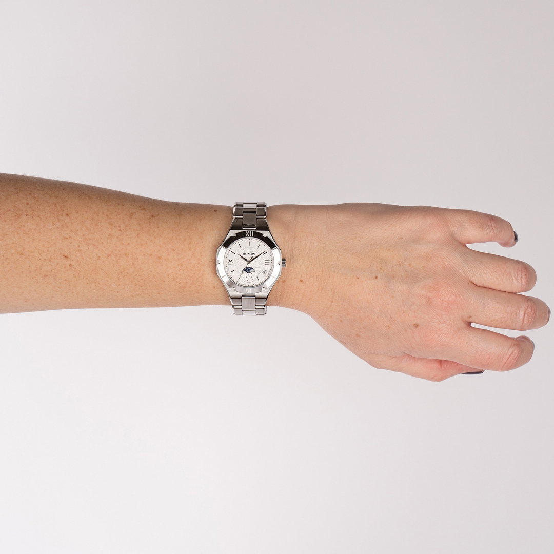 Das typische Bindeglied von Balmain ist zentral mit dem makellos runden Gehäuse verbunden. Diese Uhren sind für die Frauen von heute gemacht, die Zeit als ein wertvolles Gut betrachten, das sie nach ihren eigenen Vorstellungen gestalten. Glatte, reflektierende Metalloberflächen erinnern daran, dass die Auswahl der richtigen Accessoires eine wahre Kunst ist und nur stilvoll gelingt.