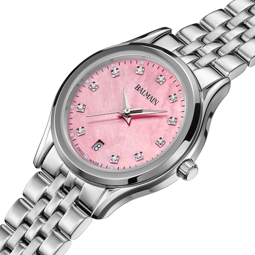 Die Uhren von Balmain, mit dem prestigeträchtigen Label Swiss Made, werden in Saint-Imier hergestellt, der Wiege der traditionellen Uhrmacherkunst im Herzen des Jura. Alle Balmain-Uhren erfüllen die gleichen strengen Qualitätskriterien: Sie sind erhältlich in preiswerten Edelstahl Ausführungen, aufwendigen goldigen oder rosafarbenen PVD Beschichtungen bis hin zu extravaganten Verzierungen mit Diamanten. Jedes Detail ist perfekt verarbeitet, passt auf den roten Teppich der Stars oder auf den Bürgersteig der Stadt und ergänzt den dynamischen männlichen und weiblichen Lebensstil von heute. Die Dekoration mit Arabesken ist ein charakteristischer Akzent im Design der Zeitmesser. Balmain-Uhren setzen sich dafür ein, die Tradition der massgeschneiderten Zeit in die Zukunft zu tragen. Schweizer Uhrmacherkompetenz und Innovation haben zu Kollektionen geführt, die die Raffinesse und den Reiz der Haute Couture genau widerspiegeln. Kühne, attraktive Formen prägen die Handschrift der Uhren. Die Geschichte der Uhrenmarke umfasst eine Reihe von Premieren und Aufsehen erregenden Ausführungen. In den 1990er Jahren setzte Balmain in noch nie dagewesener Weise Diamantfassungen in Uhrengehäusen aus Stahl ein. 1998 präsentierte die Chronolady den weltweit kleinsten Chronographen für eine Damenuhr.