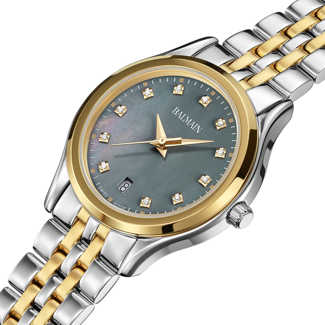 Die Uhren von Balmain, mit dem prestigeträchtigen Label Swiss Made, werden in Saint-Imier hergestellt, der Wiege der traditionellen Uhrmacherkunst im Herzen des Jura. Alle Balmain-Uhren erfüllen die gleichen strengen Qualitätskriterien: Sie sind erhältlich in preiswerten Edelstahl Ausführungen, aufwendigen goldigen oder rosafarbenen PVD Beschichtungen bis hin zu extravaganten Verzierungen mit Diamanten. Jedes Detail ist perfekt verarbeitet, passt auf den roten Teppich der Stars oder auf den Bürgersteig der Stadt und ergänzt den dynamischen männlichen und weiblichen Lebensstil von heute. Die Dekoration mit Arabesken ist ein charakteristischer Akzent im Design der Zeitmesser. Balmain-Uhren setzen sich dafür ein, die Tradition der massgeschneiderten Zeit in die Zukunft zu tragen. Schweizer Uhrmacherkompetenz und Innovation haben zu Kollektionen geführt, die die Raffinesse und den Reiz der Haute Couture genau widerspiegeln. Kühne, attraktive Formen prägen die Handschrift der Uhren. Die Geschichte der Uhrenmarke umfasst eine Reihe von Premieren und Aufsehen erregenden Ausführungen. In den 1990er Jahren setzte Balmain in noch nie dagewesener Weise Diamantfassungen in Uhrengehäusen aus Stahl ein. 1998 präsentierte die Chronolady den weltweit kleinsten Chronographen für eine Damenuhr.