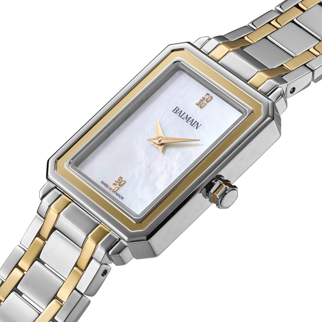 Ein Symbol für raffinierte Eleganz und zeitlose Schönheit. Die Balmain Eirini besticht durch ihr elegantes rechteckiges Design mit einer Gehäusegrösse von 33 x 25 mm. Die filigranen Linien und das makellose Zifferblatt strahlen Luxus aus und verleihen jeder Bewegung einen Hauch von Glamour. Ob am Abend oder im Alltag, die Eirini verleiht Ihrem Stil eine besondere Note und unterstreicht mit jedem Blick das luxuriöse Balmain-Gefühl.