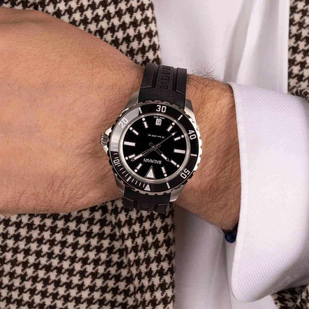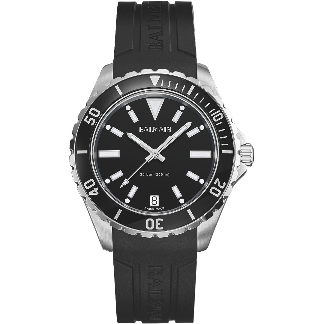 Die Balmain Ophrys Gent folgt dem Ruf des Meeres und verbindet maskuline Eleganz mit robuster Funktionalität. Als markante Taucheruhr beeindruckt sie mit einem Gehäuse von 42,5 mm, einer verschraubten Krone und einer drehbaren Lünette - perfekt für Abenteurer. Mit einer Wasserdichtigkeit bis 20 bar (200 Meter) und einer Datumsanzeige ist sie der ideale Begleiter für jede Herausforderung, ob über oder unter Wasser. Entdecken Sie den unverwechselbaren Stil und die technische Perfektion von Balmain.