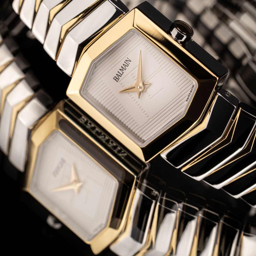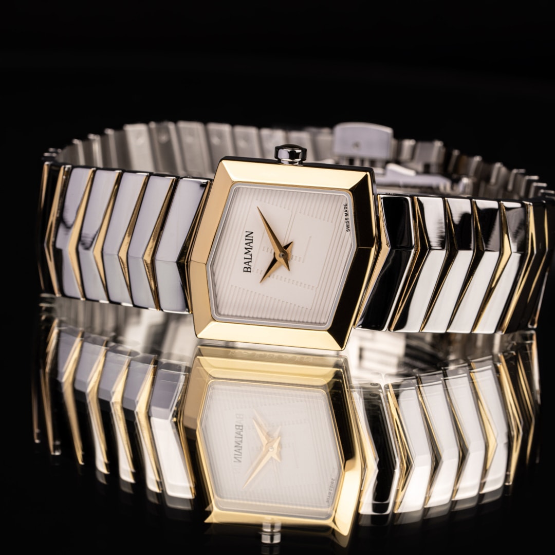 Die Uhren von Balmain, mit dem prestigeträchtigen Label Swiss Made, werden in Saint-Imier hergestellt, der Wiege der traditionellen Uhrmacherkunst im Herzen des Jura. Alle Balmain-Uhren erfüllen die gleichen strengen Qualitätskriterien: Sie sind erhältlich in preiswerten Edelstahl Ausführungen, aufwendigen goldigen oder rosafarbenen PVD Beschichtungen bis hin zu extravaganten Verzierungen mit Diamanten. Jedes Detail ist perfekt verarbeitet, passt auf den roten Teppich der Stars oder auf den Bürgersteig der Stadt und ergänzt den dynamischen männlichen und weiblichen Lebensstil von heute. Die Dekoration mit Arabesken ist ein charakteristischer Akzent im Design der Zeitmesser. Balmain-Uhren setzen sich dafür ein, die Tradition der massgeschneiderten Zeit in die Zukunft zu tragen. Schweizer Uhrmacherkompetenz und Innovation haben zu Kollektionen geführt, die die Raffinesse und den Reiz der Haute Couture genau widerspiegeln. Kühne, attraktive Formen prägen die Handschrift der Uhren. Die Geschichte der Uhrenmarke umfasst eine Reihe von Premieren und Aufsehen erregenden Ausführungen. In den 1990er Jahren setzte Balmain in noch nie dagewesener Weise Diamantfassungen in Uhrengehäusen aus Stahl ein. 1998 präsentierte die Chronolady den weltweit kleinsten Chronographen für eine Damenuhr.