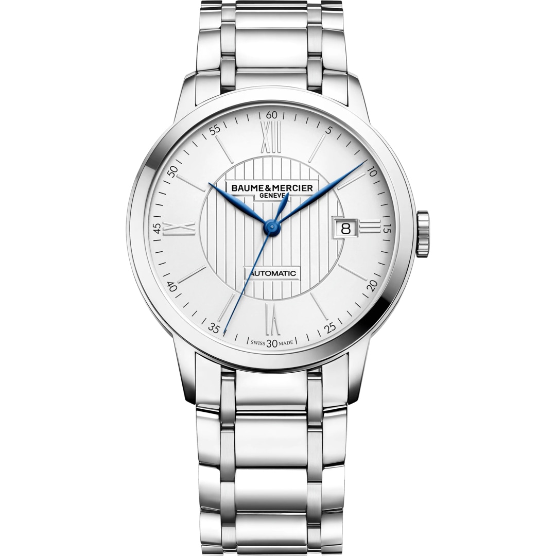 Die Classima 10215 für Herren vereint den modernen Reiz von Edelstahl mit einem anspruchsvollen Design. Ein Edelstahlarmband, ein poliertes, rundes Edelstahlgehäuse mit einem Durchmesser von 40 mm, blaue Zeiger und ein silberfarbenes Zifferblatt, kombiniert mit der kultigen Linien-Guillochierung von Baume et Mercier und den Römischen Ziffern für die Stundenmarkierung machen aus dieser Edelstahluhr mit Automatikuhrwerk den idealen Zeitmesser für die Herren, die geschmackvolle Qualität und die Stärke des widerstandsfähigsten Metalls zu schätzen wissen.