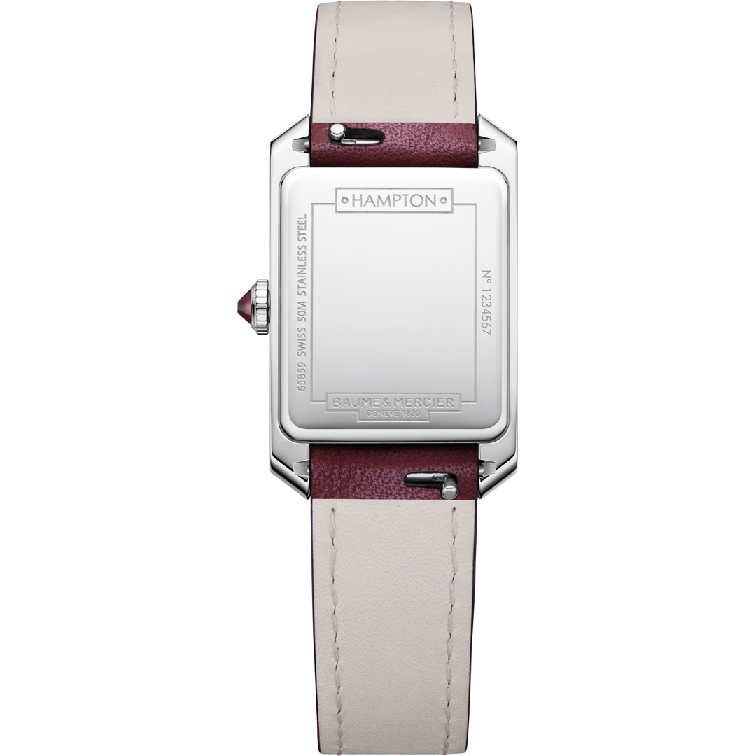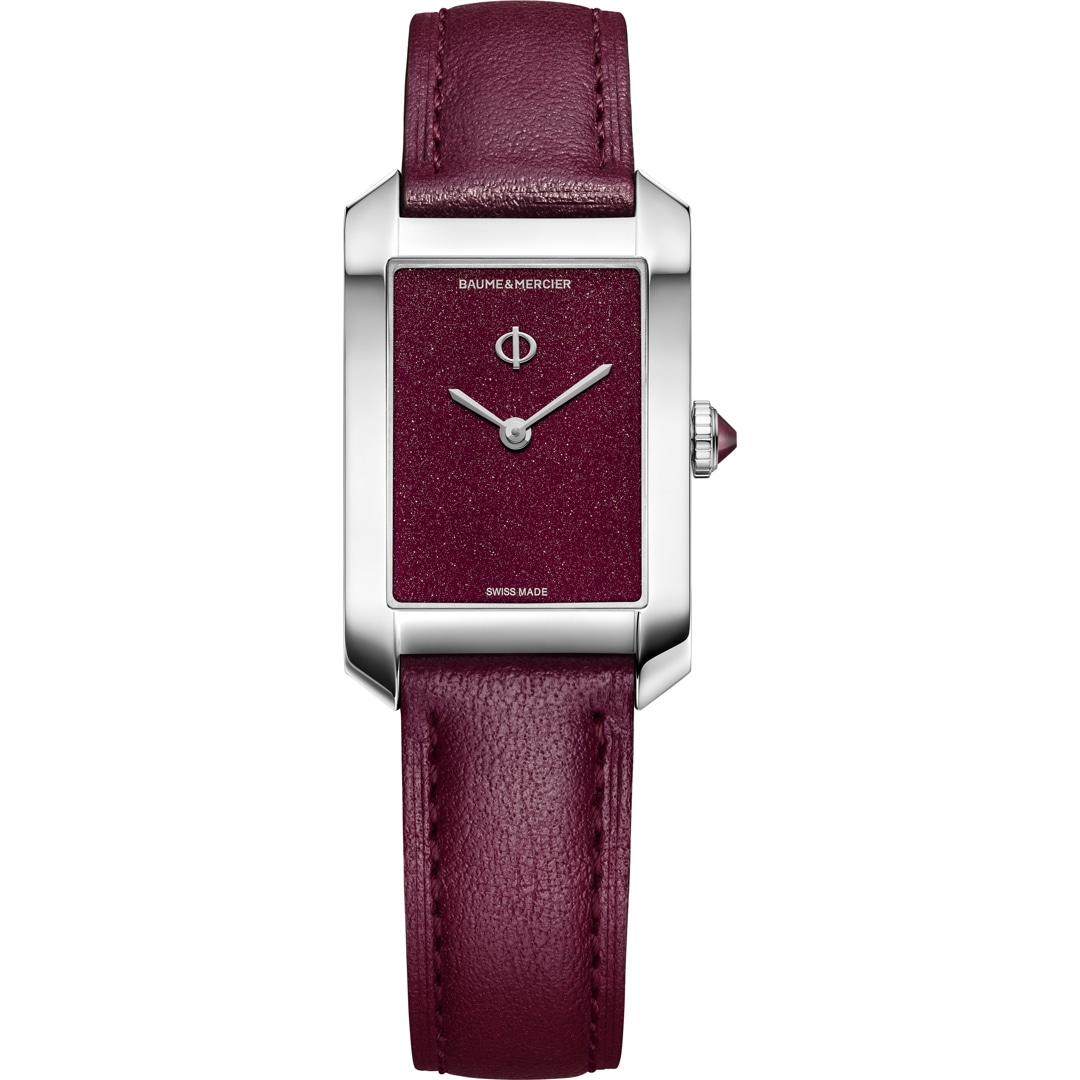 Die Hampton von Baume et Mercier mit schlankem Gehäuse und ausgewogenen Proportionen sind die würdigen Erben dieser Philosophie. Ihr Gehäuse aus Edelstahl wird von einem gewölbten kratzfesten Saphirglas geschützt. Es beherbergt ein Quarzwerk der neuen Generation mit einer Gangreserve von acht Jahren, das die Stunden und Minuten anzeigt. Dieses Modell imponiert zudem durch eine harmonische Kombination von Farbe und Material. Dieser rechteckige Zeitmesser aus poliertem Edelstahl verfügt über ein burgunderrotes Zifferblatt und ein glitzerndes burgunderrotes Kalbslederarmband für einen monochromen und eleganten Touch. Überzogen ist das Zifferblatt mit einem zarten Glitzerlack, der von Sternrubinsteinen inspiriert ist und ein Funkeln erzeugt, das die Weiblichkeit dieser raffinierten Uhr akzentuiert. Das durch die Lünette einfallende Licht verleiht der Damenuhr Leben und Relief. Das Streben nach einem schlichten Design, ein Markenzeichen der Zeitmesser von Baume & Mercier, zeigt sich in den minimalistischen Schwertzeigern und einem eleganten bei 12 Uhr platzierten applizierten Phi-Symbol, dem Logo der Maison.