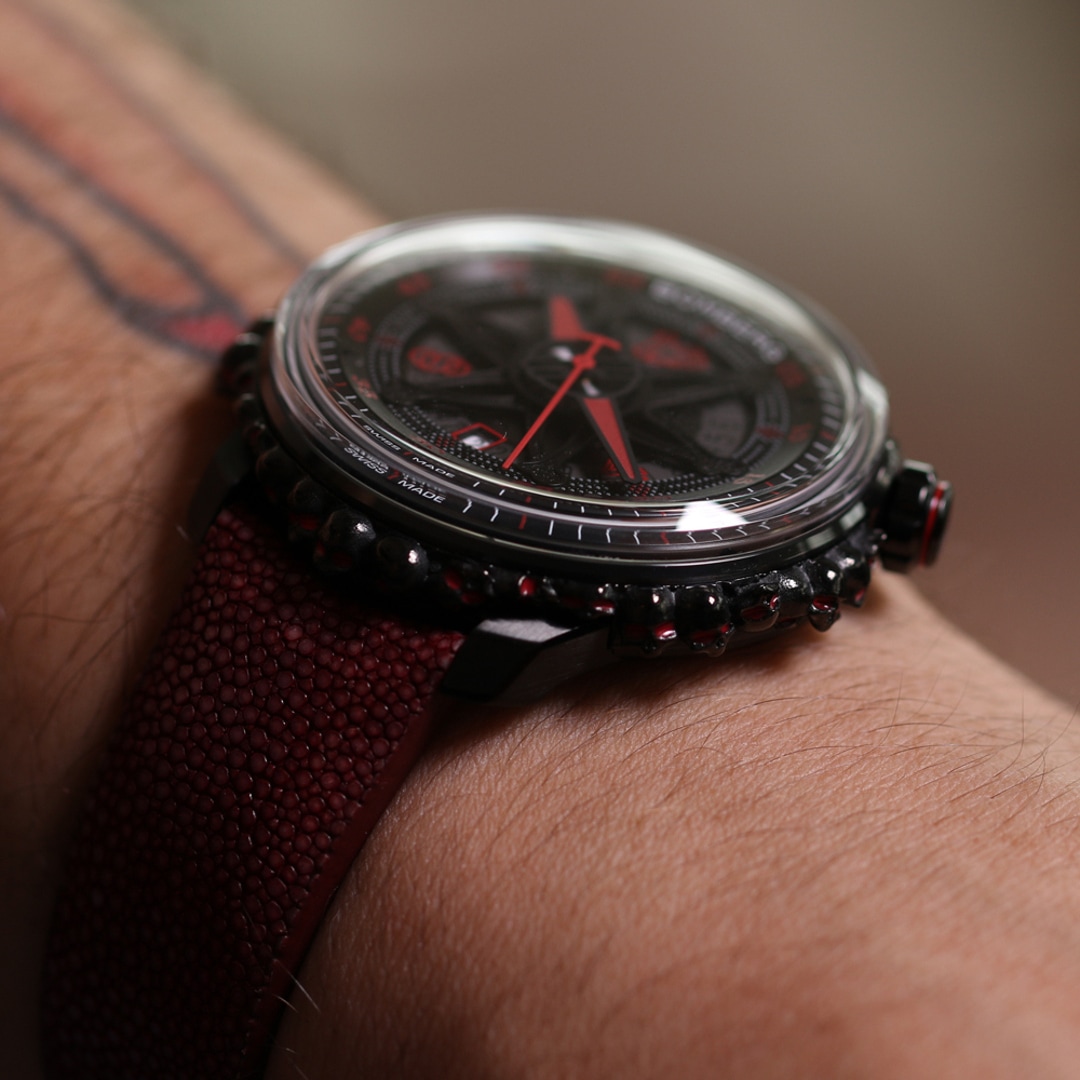 Für Biker, Rock- und Metallfans gibt es nun die limitierte Edition „CATACOMB“, inspiriert von den unterirdischen Gängen der Katakomben, eine Uhr, die einen Look als cooles Lifestyle-Accessoire perfekt abrundet, und Gothic-Esprit und Metaphern zu Leben und Tod verbindet. Das Negative unten, das Positive oben, der Tod unterirdisch, das Leben oberirdisch, der begrabene Held lebt im Schoß der Erde; ein langsames, schläfriges, aber ewiges Leben. Das Labyrinth der Katakomben wird zum Labyrinth des Unbewussten, zum Schauplatz des Traumes. Es gibt kein schnelles Labyrinth, man verstrickt sich in Verzweigungen, Sackgassen und letzten Winkeln. Und von diesem gesamten Universum, das häufig Tattoos inspiriert, ist hier das Design des Zifferblatts inspiriert. Ein fliessender Übergang zwischen Genres, Strasse und High-Fashion, Gegenkultur und Mainstream, Individuum und Gemeinschaft ... die Uhr ist einzigartig und unverkennbar mit ihrem rauchfarbenem Zifferblatt, dem boxförmigen Saphirglas und aneinandergereihten Totenköpfen mit leuchtenden, lachenden, neugierigen oder schaurigen Augen. Die Farbe ihrer Blicke verweist an die Indizes der Uhr.