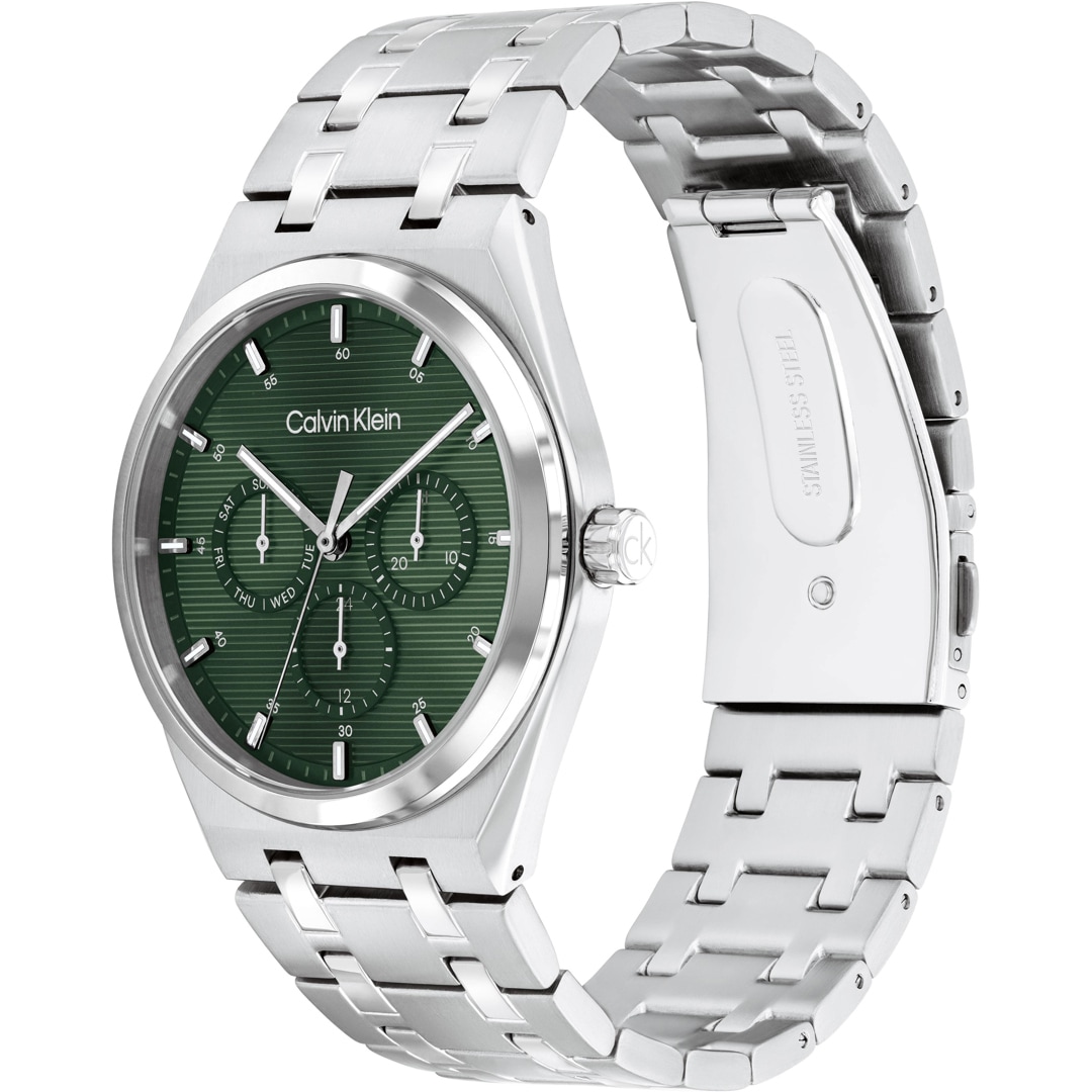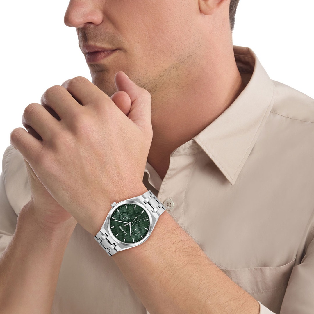 Eine gutaussehende Armbanduhr ist für einen Mann mit Stil genauso unverzichtbar wie eine Jeans, die perfekt sitzt. Calvin Klein zeigt, wie es geht und liefert die ck Motion, die nicht nur als perfektes Accessoire Ihren individuellen Look komplettiert, sondern Ihnen auch zuverlässig anzeigt, welches Stunde geschlagen hat. Die Motion trägt dabei aber nicht pompös auf. Klar und simpel strukturiert tut diese Uhr, was eine Uhr einer so einflussreichen Marke wie Calvin Klein tun muss. In dem Edelstahlgehäuse tickt ein hochwertiges Multifunktion-Quarz-Uhrwerk. Das gehärtete Mineralglas und eine Wasserdichtigkeit von mindestens 30 Meter machen die Herrenuhr in allen Situationen zum passenden Begleiter. Modernes Design in bewusst zum Ausdruck gebrachter, purer Reinheit.