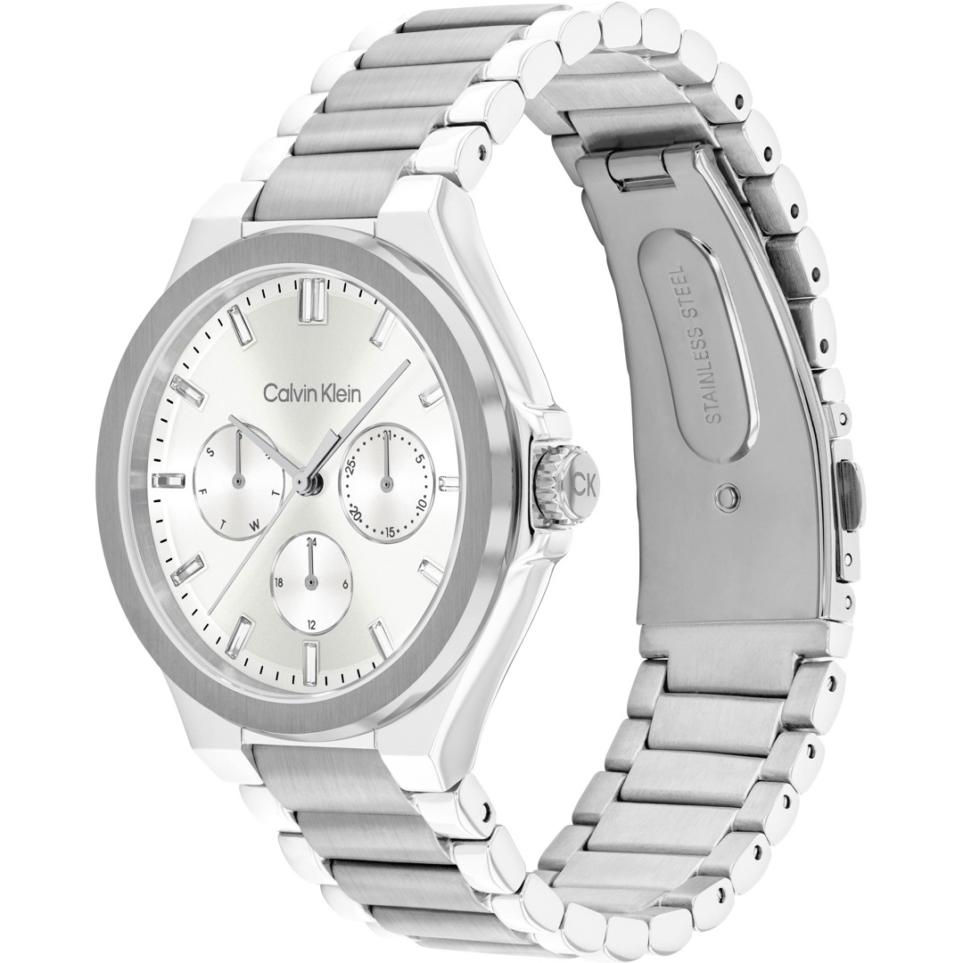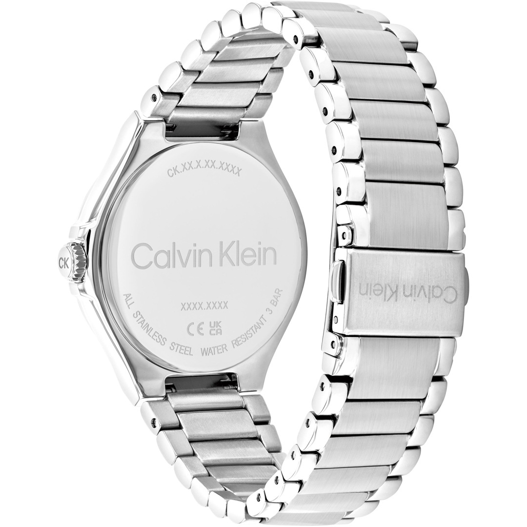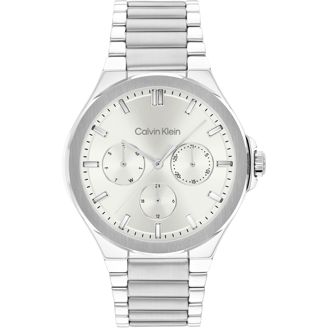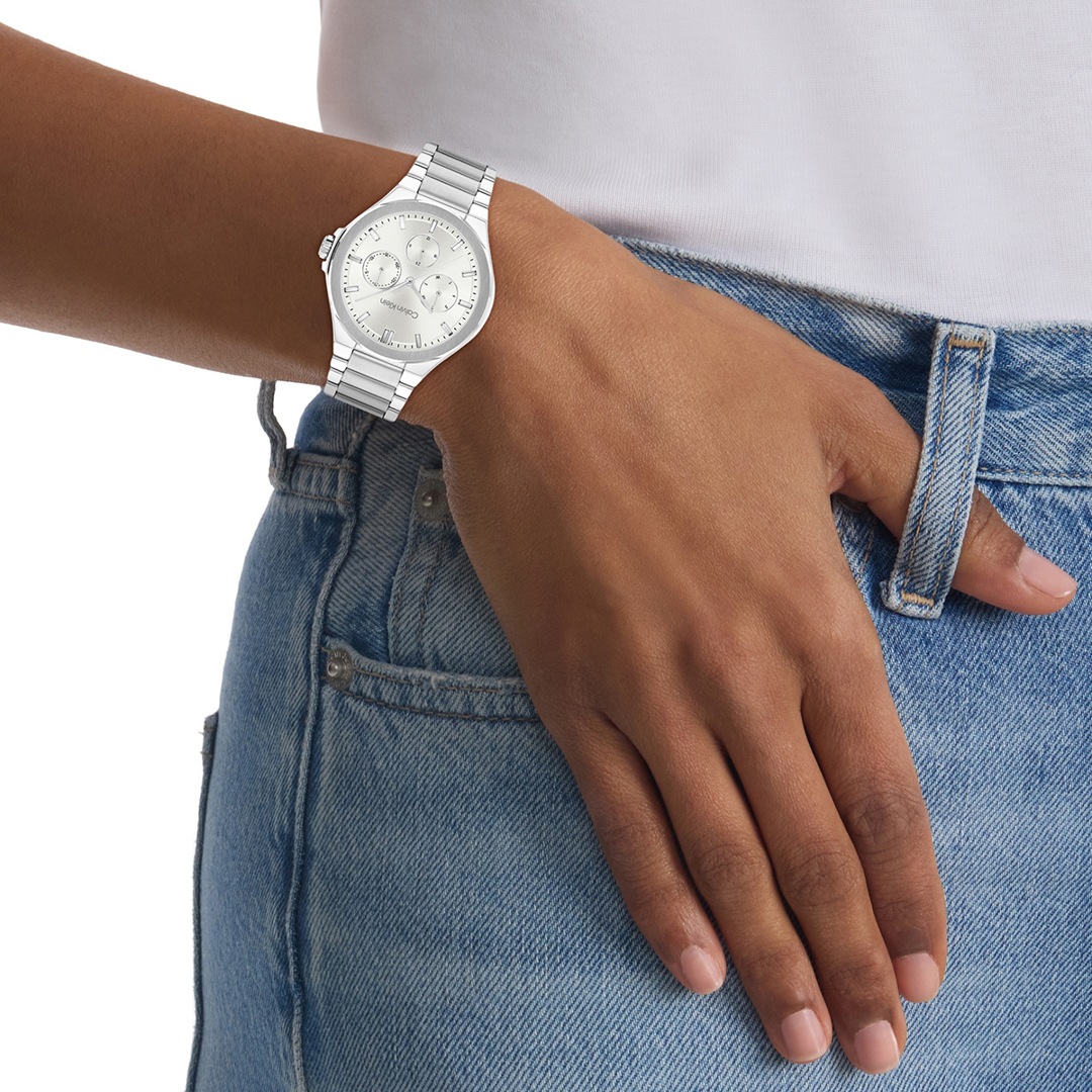 Die CK Vibrancy Day Date hat ihren ganz besonderen Look. Ihr Ziffernblatt hebt sich vom Gehäuse aus poliertem Edelstahl ab und verbindet pure Schönheit mit einem soliden, zeitgenössischen Design.