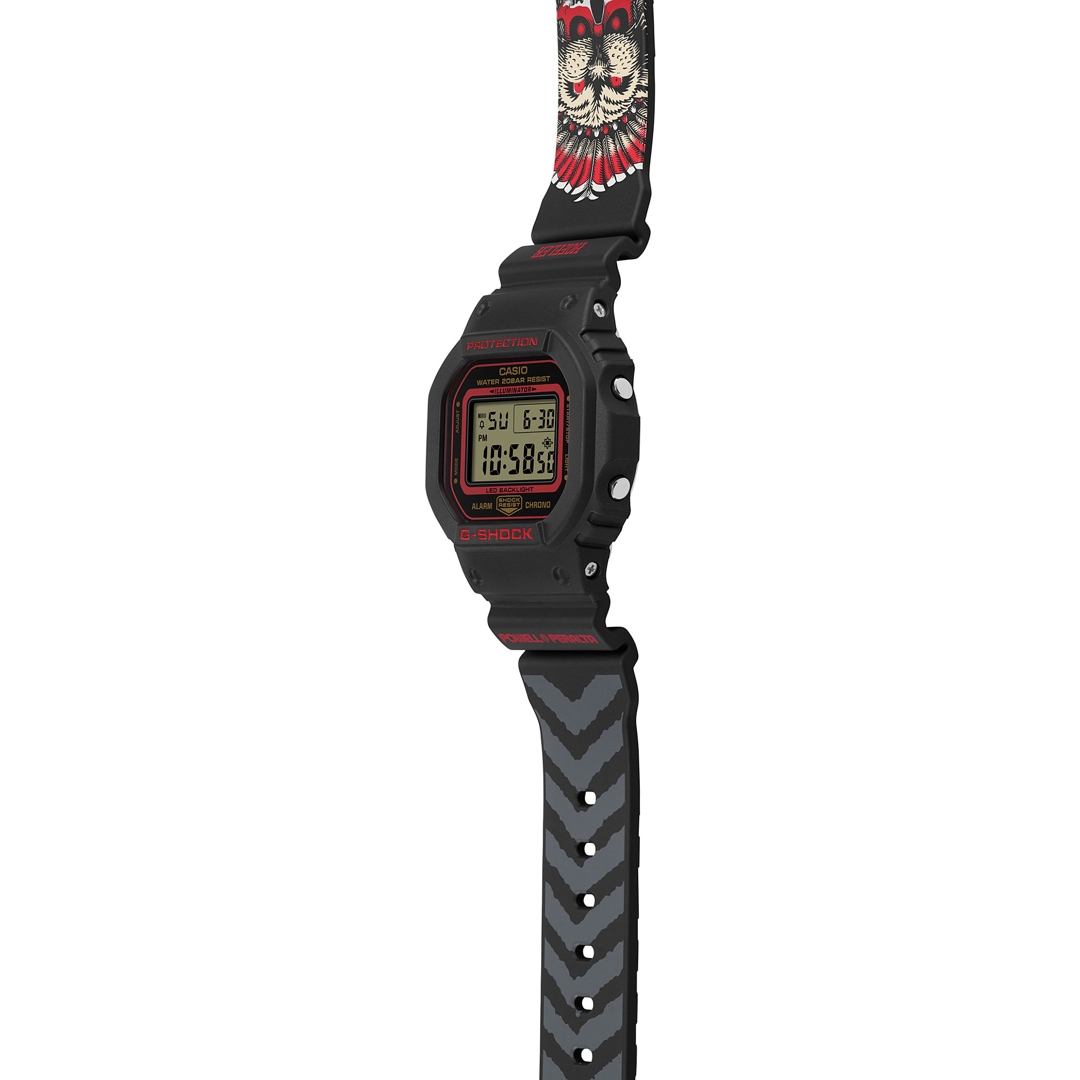 Die klassische DW-5600 verleiht Ihnen urbanes Flair – mit der typischen Hoefler-Grafik auf dem Armband und der Signatur des Olympiasiegers im Skateboard auf der Rückseite des Gehäuses. Wenn Sie per Knopfdruck die LED-Hintergrundbeleuchtung aktivieren, wird auf dem Display das Logo von Powell Peralta angezeigt.