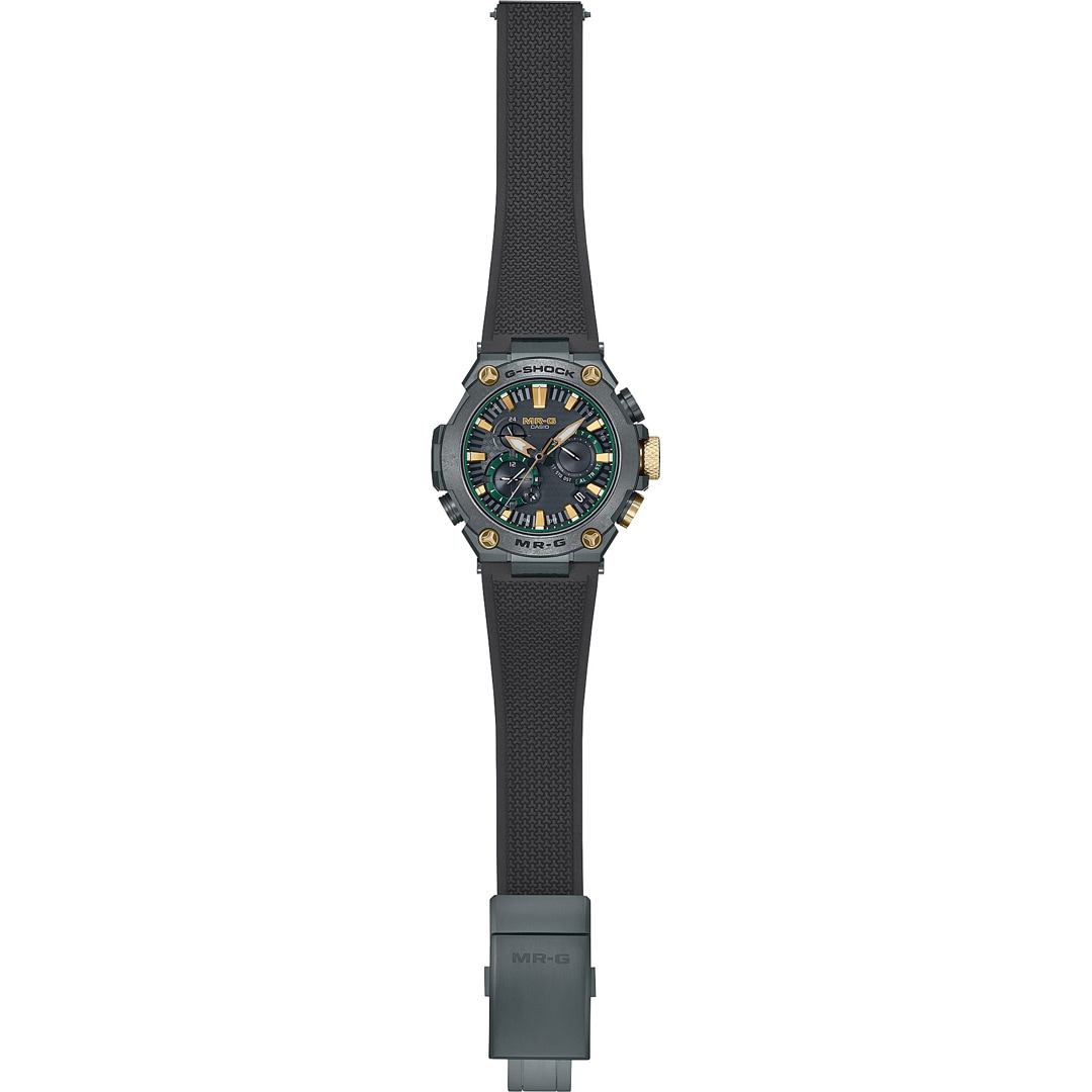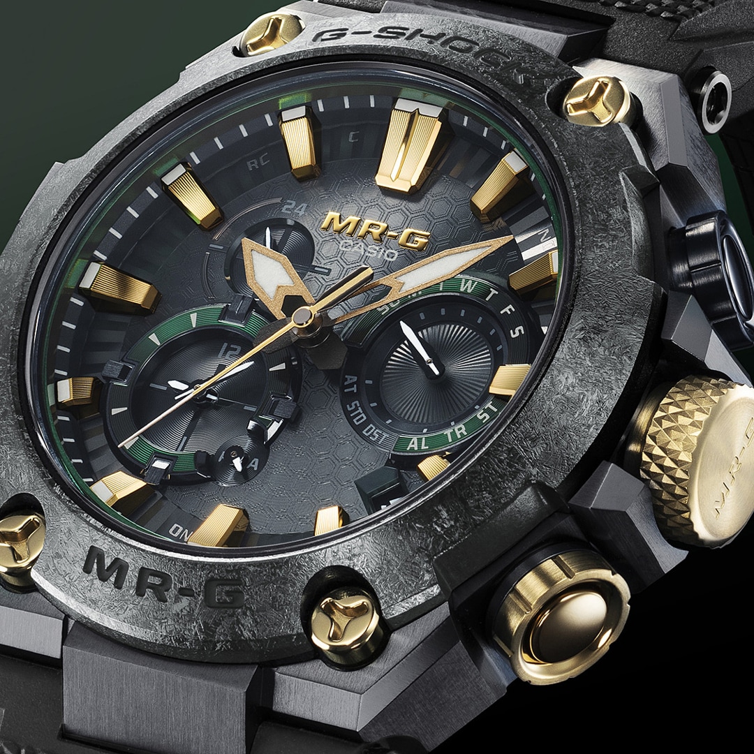 Die MRG-B2000RG aus der exklusiven MR-G Linie repräsentiert die Spitze der G-SHOCK Kollektion und vereint japanische Handwerkskunst mit modernster Technologie. Inspiriert von der traditionellen Farbe „Kurogane-iro“, erinnert das tiefgrüne Finish an das erhitzte Eisen klassischer japanischer Rüstungen. Dieser Effekt wird durch eine Tiefenhärtung und eine grüne DLC-Beschichtung auf dem Titangehäuse erzielt.
