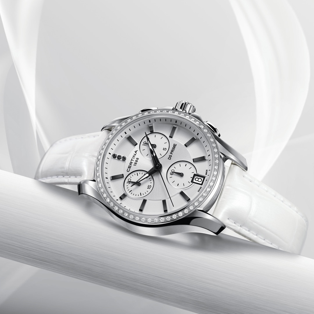 Die Liebe zum Detail sorgt für den feinen Unterschied. Der Wechsel der satinierten und polierten Oberflächen des Gehäuses, geometrische Kontraste und die feinen Texturnuancen des Zifferblatts verleihen der DS Prime eine attraktive Ausstrahlung. Einen luxuriösen Touch zaubern drei Diamanten auf dem Zifferblatt. Die DS Prime wäre keine Certina, wenn sie nicht mit dem doppelten Sicherheitskonzept DS ausgestattet wäre. Damit ist sie wasserdicht bis zu einem Druck von 10 bar (100 m) und eine zuverlässige Begleiterin, auch bei einem sportiven Lebensstil.