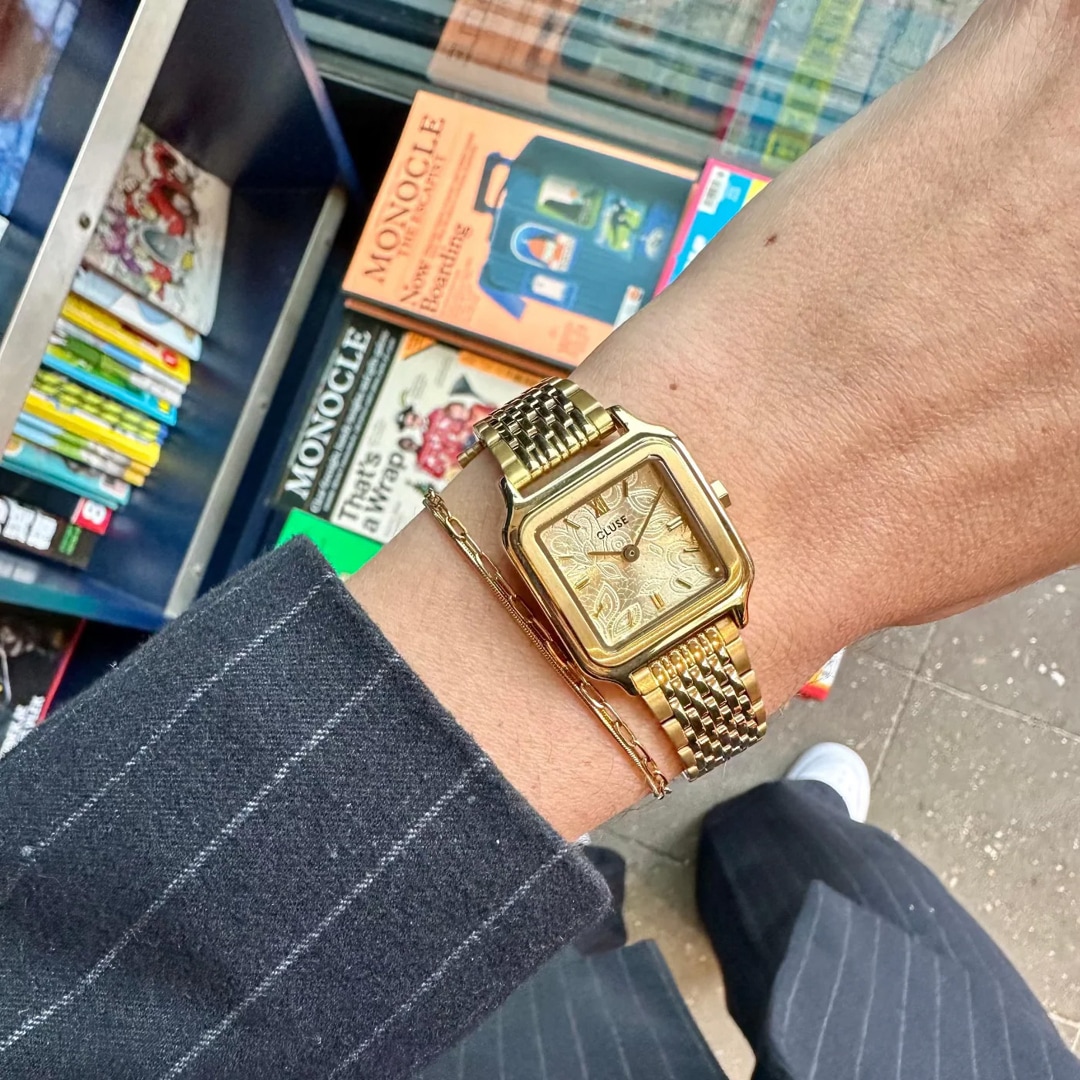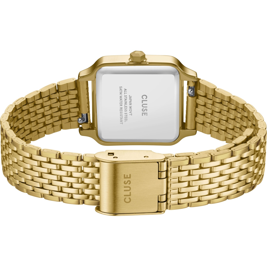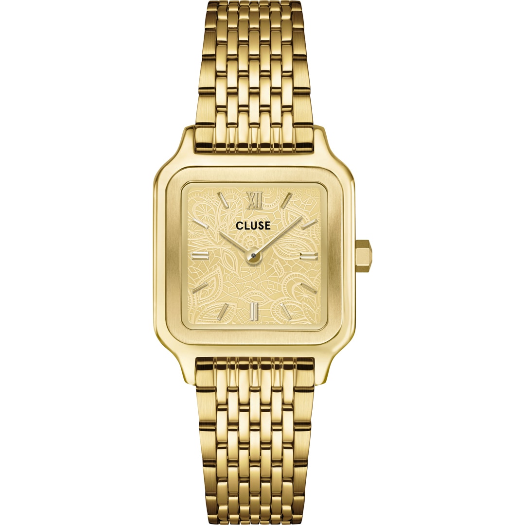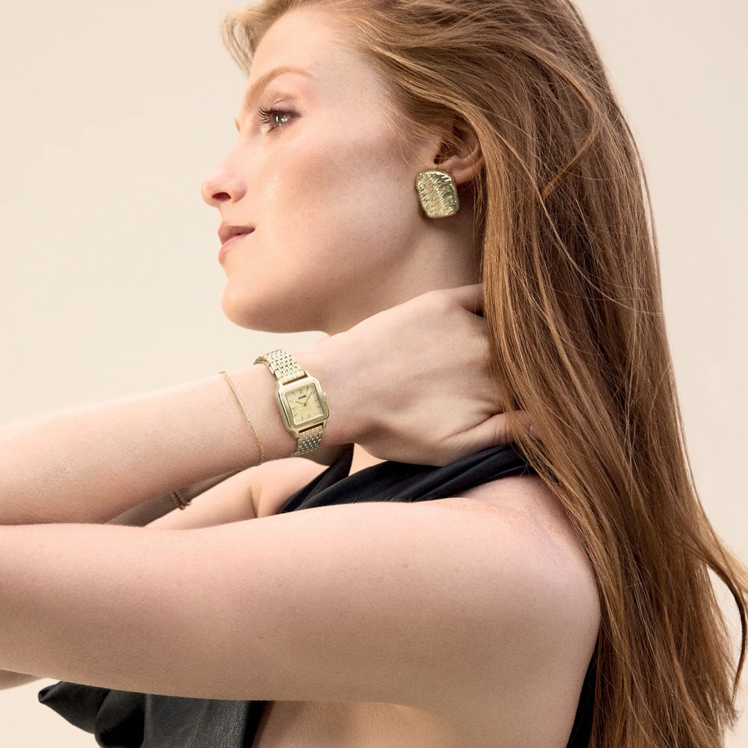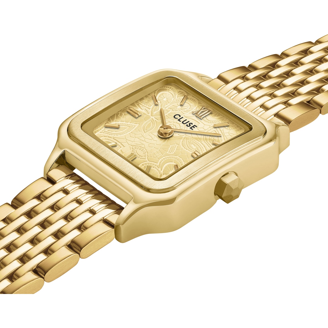 Eine edle Ergänzung für jede Uhrensammlung: die Gracieuse Petite Uhr für Damen. Mit einem quadratischen, goldfarbenen 24-mm-Gehäuse, Zifferblatt mit Spitzenmuster und einem 14 mm breiten, goldfarbenen 9-Glieder-Armband aus Edelstahl. Dieser goldfarbene Hingucker verleiht all Ihren Looks einen glamourösen Touch. Passen Sie das Aussehen Ihrer Uhr ganz einfach mit jedem CLUSE 14-mm-Armband an. Sie können die Grösse des Armbands ganz einfach selbst einstellen.