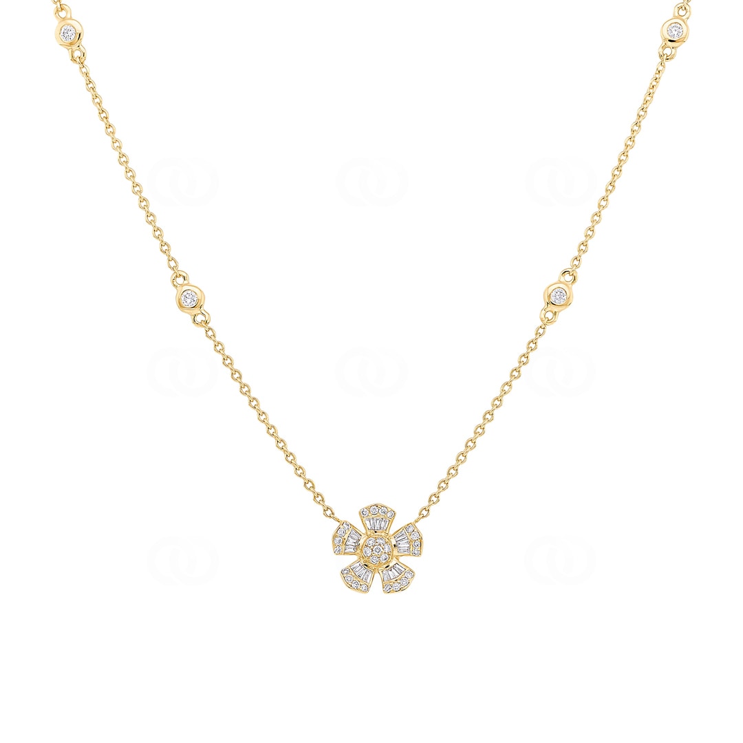 Dieses Collier aus 18 Karat Gelbgold beweist, wie aufregend klassische Motive neu interpretiert werden können. Es ist ein Schmuckstück für Liebhaberinnen feiner Details. Der Blickfang ist der kunstvolle Anhänger, der an eine stilisierte Blüte erinnert. Das Besondere ist die raffinierte Komposition im Inneren: 15 Diamanten im Baguette-Schliff formen die Blütenblätter. Ihre klaren, länglichen Linien verleihen dem Design eine moderne, fast architektonische Struktur. Kontrastiert wird diese Ruhe durch das lebhafte Feuer von insgesamt 29 Brillanten. Sie zieren nicht nur das Zentrum der Blüte, sondern sind auch als funkelnde Stationen in die feine Kette eingearbeitet. Ein exquisites Lichtspiel am Dekolleté, das technische Raffinesse mit zeitloser Ästhetik verbindet.