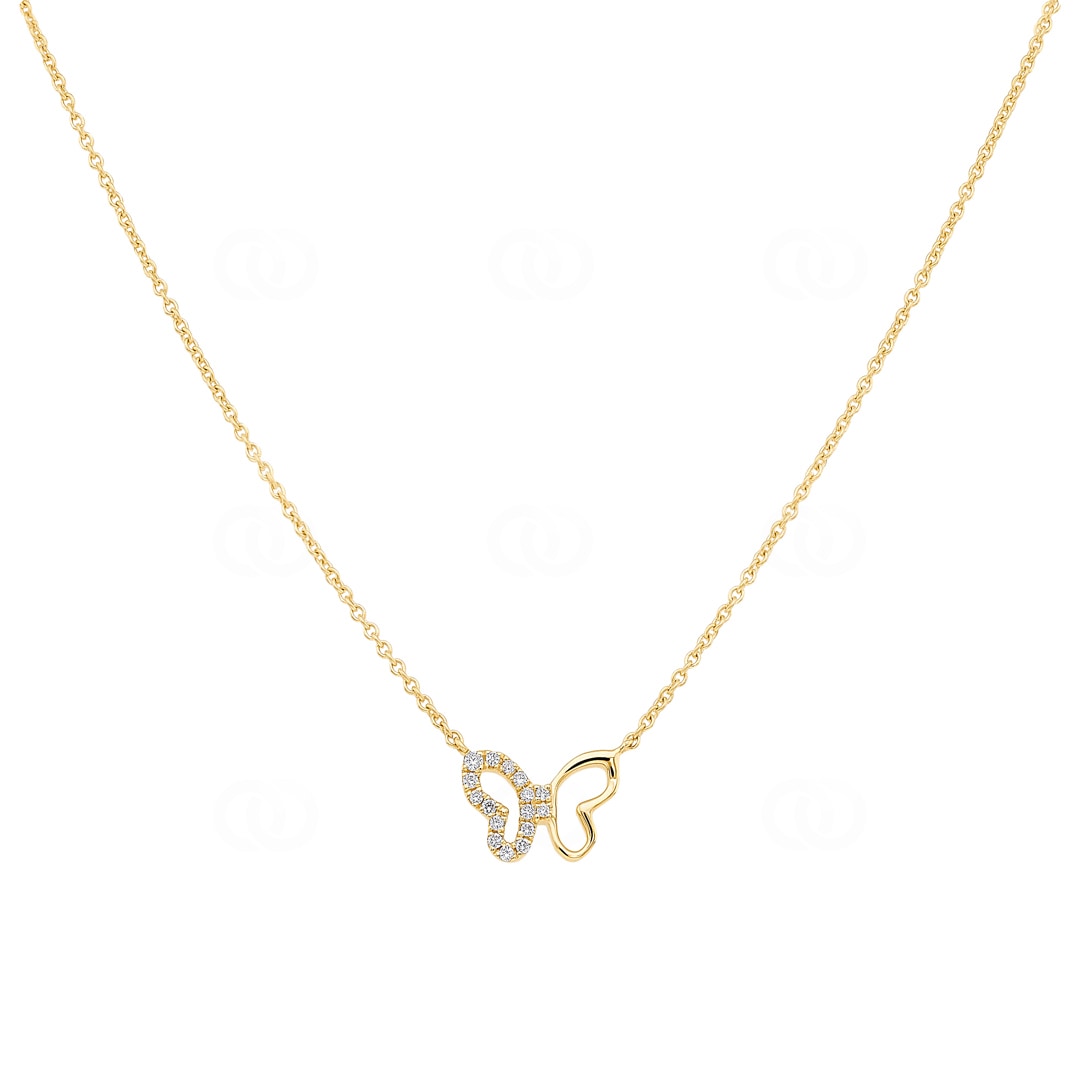 Schmetterlingszauber: Dieses exquisite Collier aus Gelbgold ist ein wahres Schmuckstück, das Eleganz und Naturverbundenheit vereint. Der integrierte Anhänger in Form eines Schmetterlings ist ein Blickfang, der jeden Betrachter verzaubert. Ein Flügel des Schmetterlings ist mit 16 funkelnden Diamanten verziert und verleiht dem Collier einen Hauch von Luxus und Glamour. Mit einer Länge von 43 cm liegt es perfekt am Hals und wird mit einem sicheren Karabinerverschluss geschlossen. Dieses Collier ist das ideale Accessoire, um jedem Outfit eine edle Note zu verleihen und ein wunderbares Geschenk für besondere Anlässe.