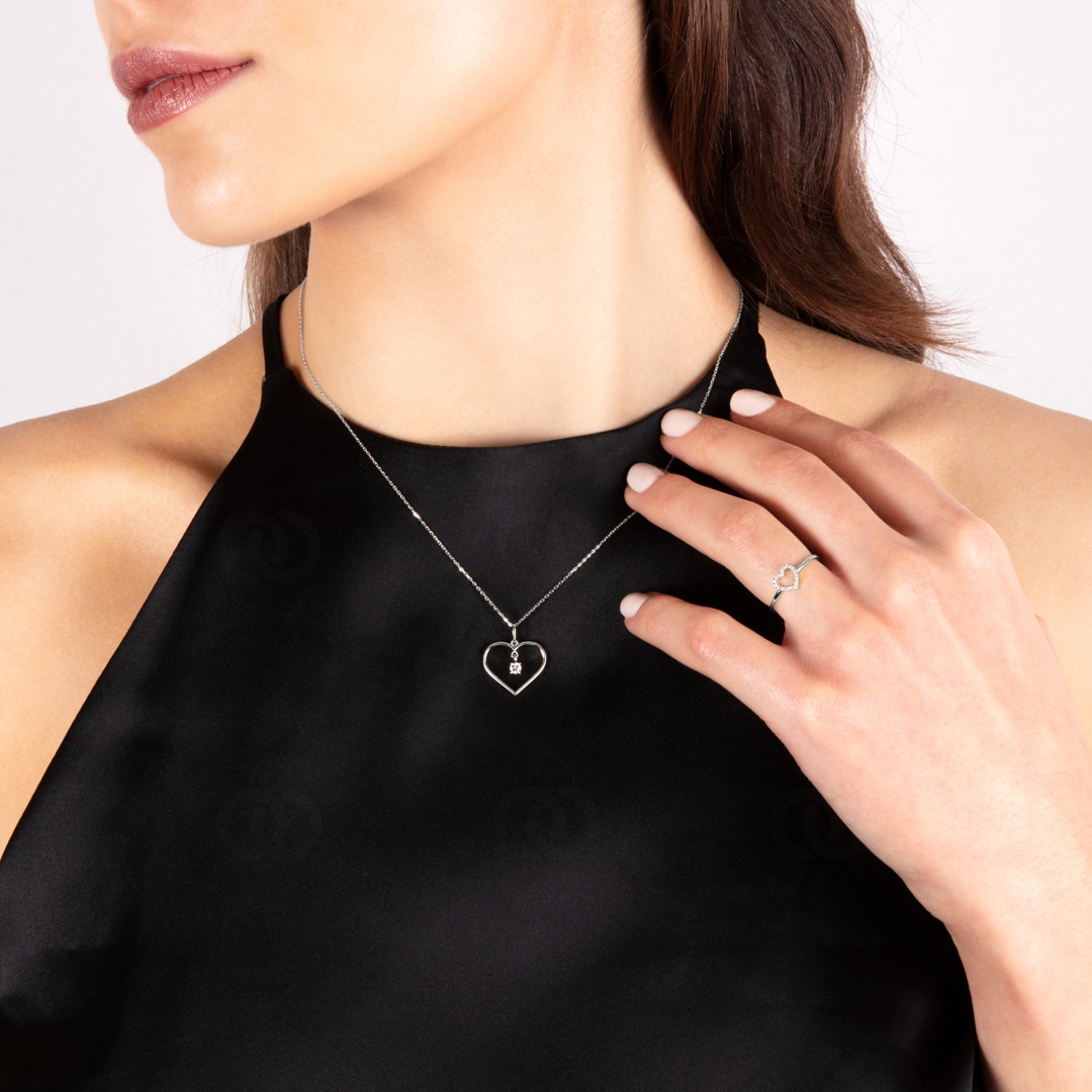 Traumhaft und zeitlos - das ist dieses Collier aus 18 Karat Weissgold, welches mit seinem Herz-Anhänger alle Blicke auf sich ziehend wird. Er ist schlicht und filigran gearbeitet und über eine Öse mit der Halskette verbunden. Inmitten des Anhängers hängt ein kleiner Brillant in einer 4-Griff Fassung und sorgt für den nötigen Glanz. Durch die Reduktion auf das Wesentliche überzeugt dieses Collier und ist trotz der zarten Silhouette keineswegs zu übersehen.