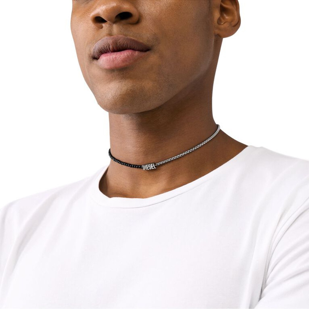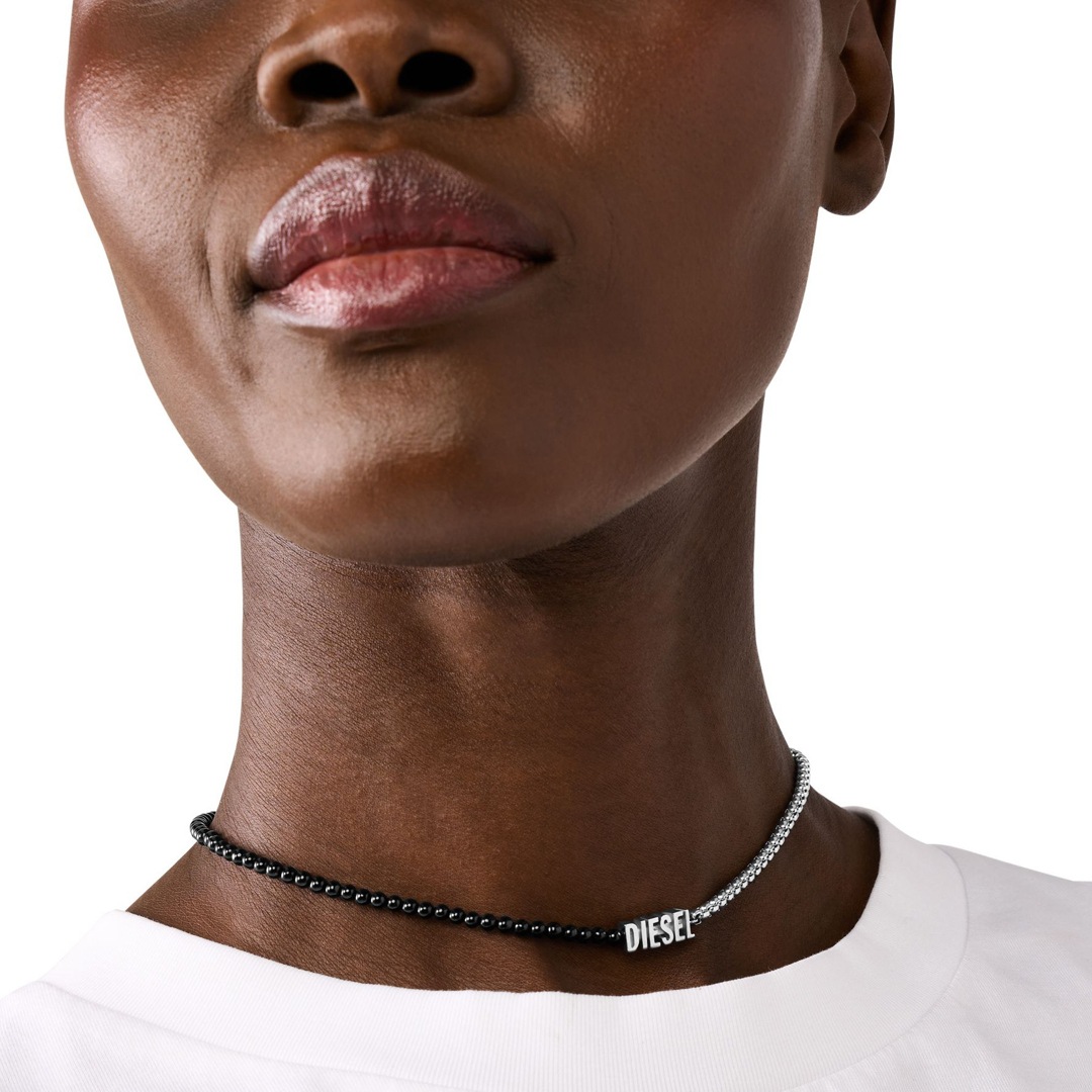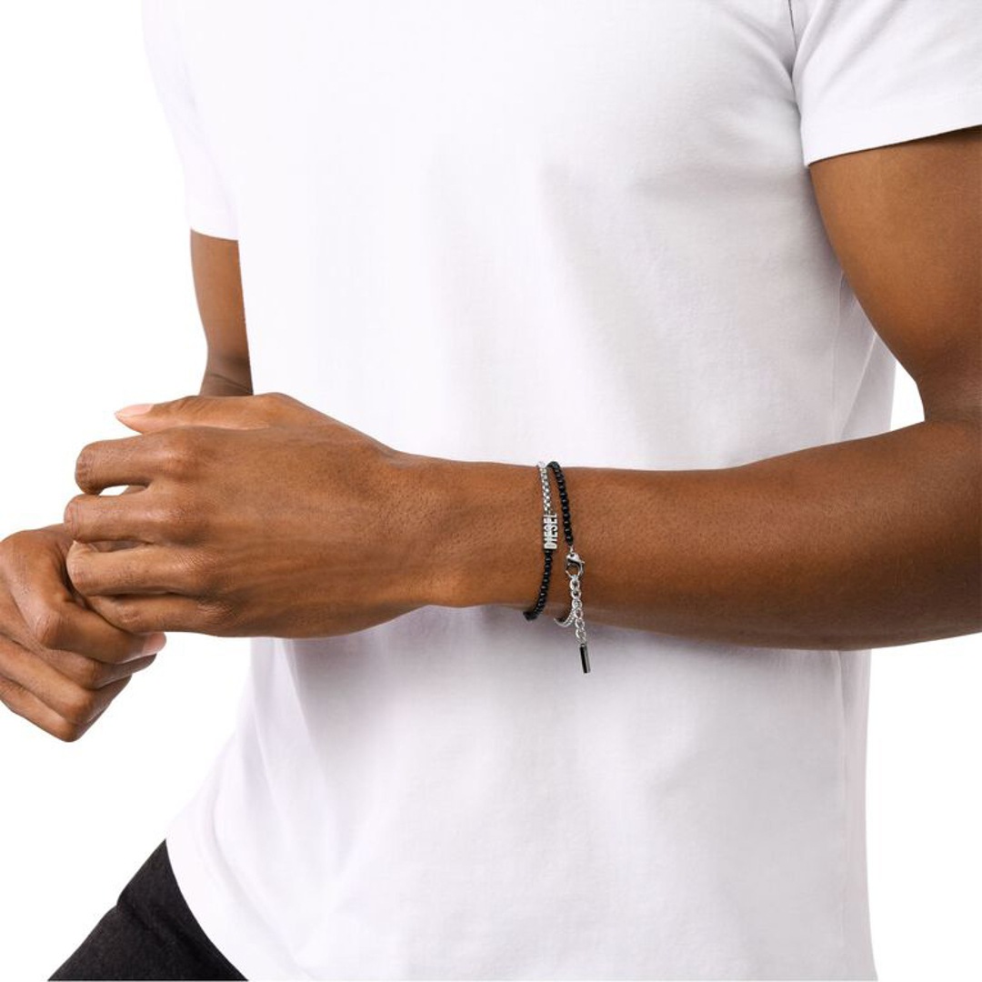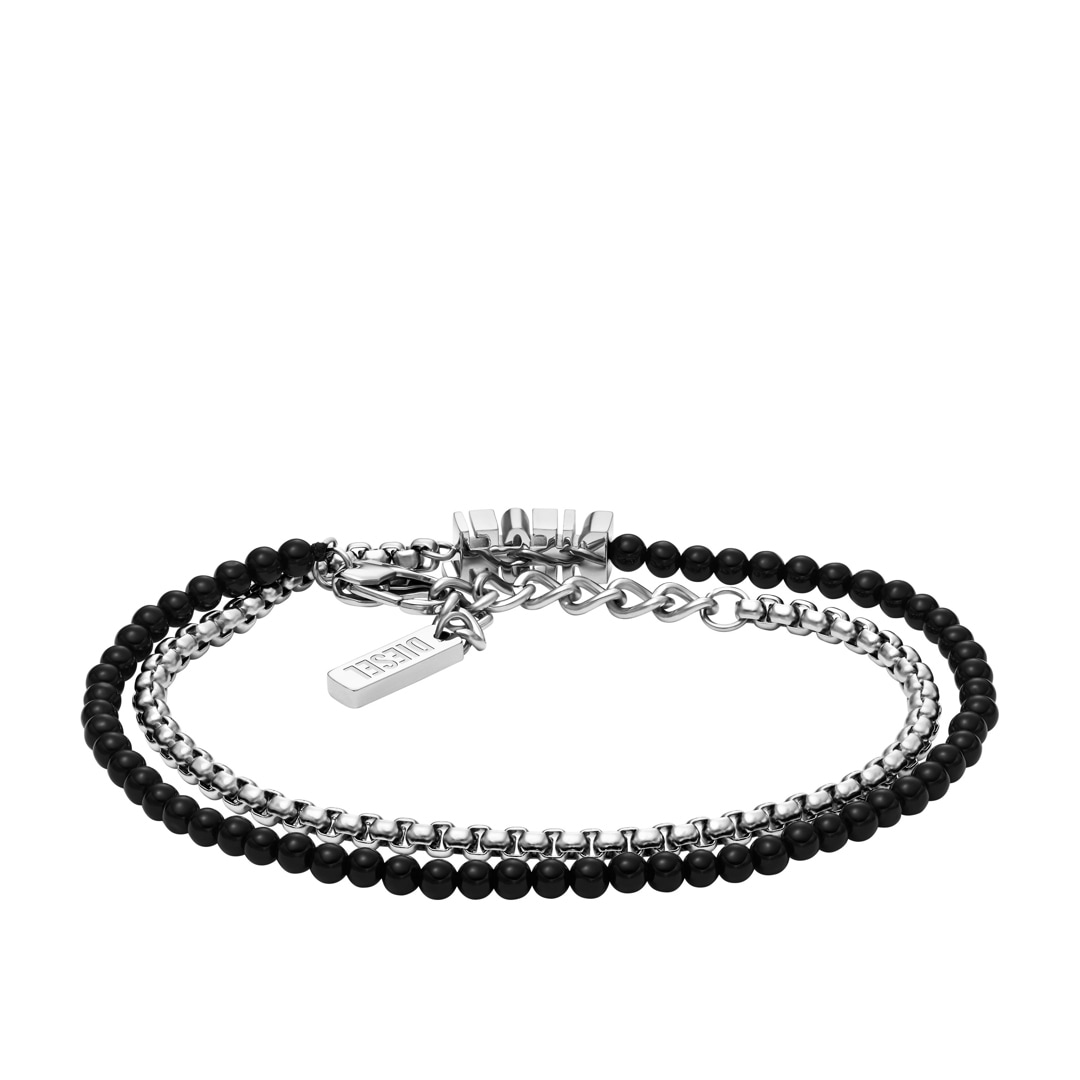 Das Perlen-Wickelarmband von Diesel besteht aus schwarzem Achat, Edelstahl und einem Karabinerverschluss.