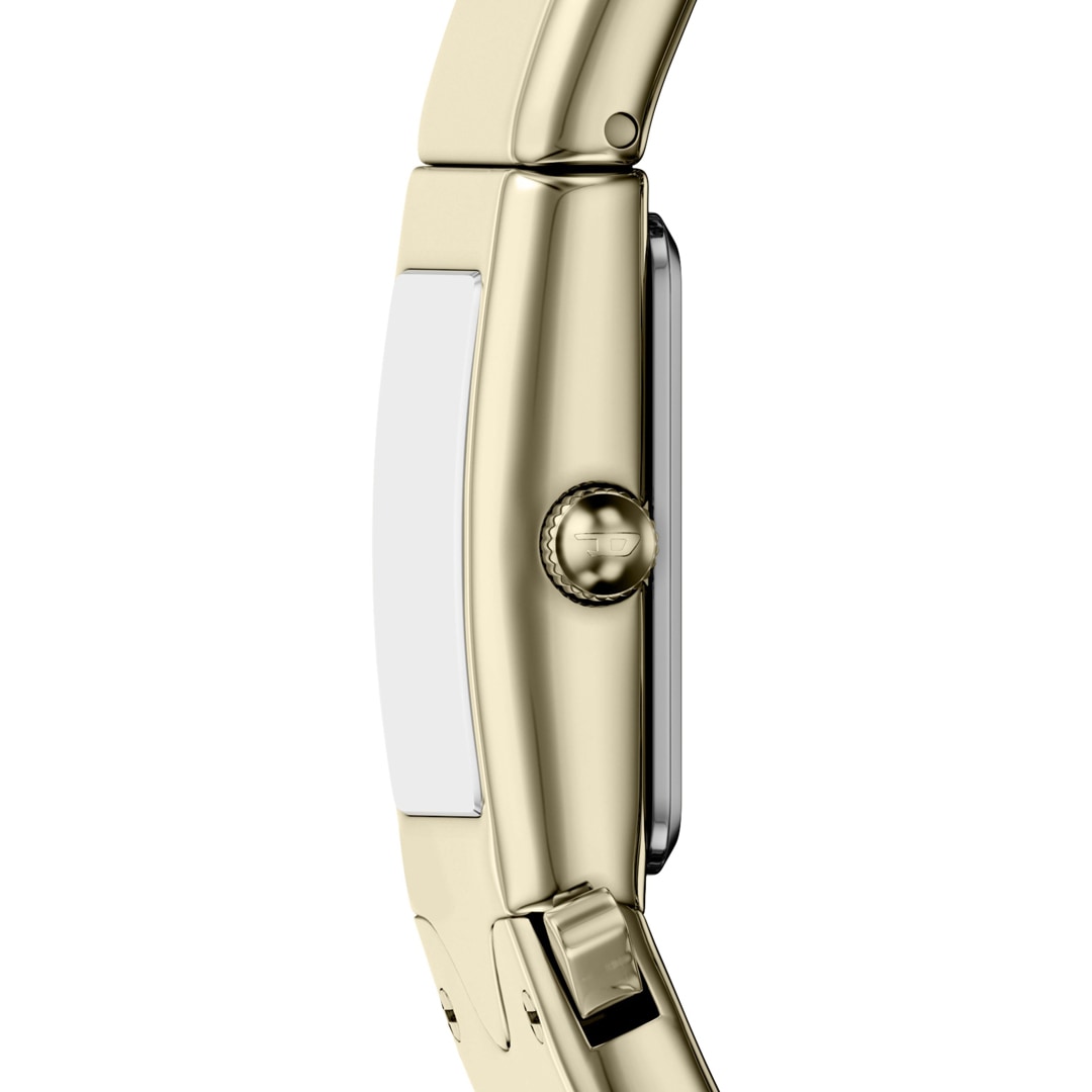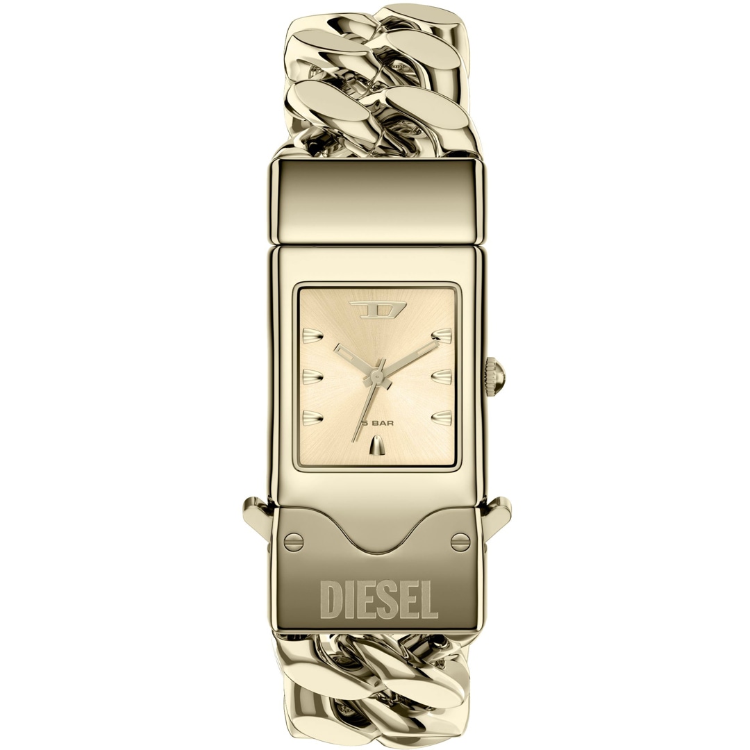 22 mm Diesel Closer Armbanduhr mit goldfarbenem Sonnenschliffzifferblatt, Uhrwerk mit drei Zeigern und goldfarbenem Armband aus Edelstahl mit Schnallenschliesse.