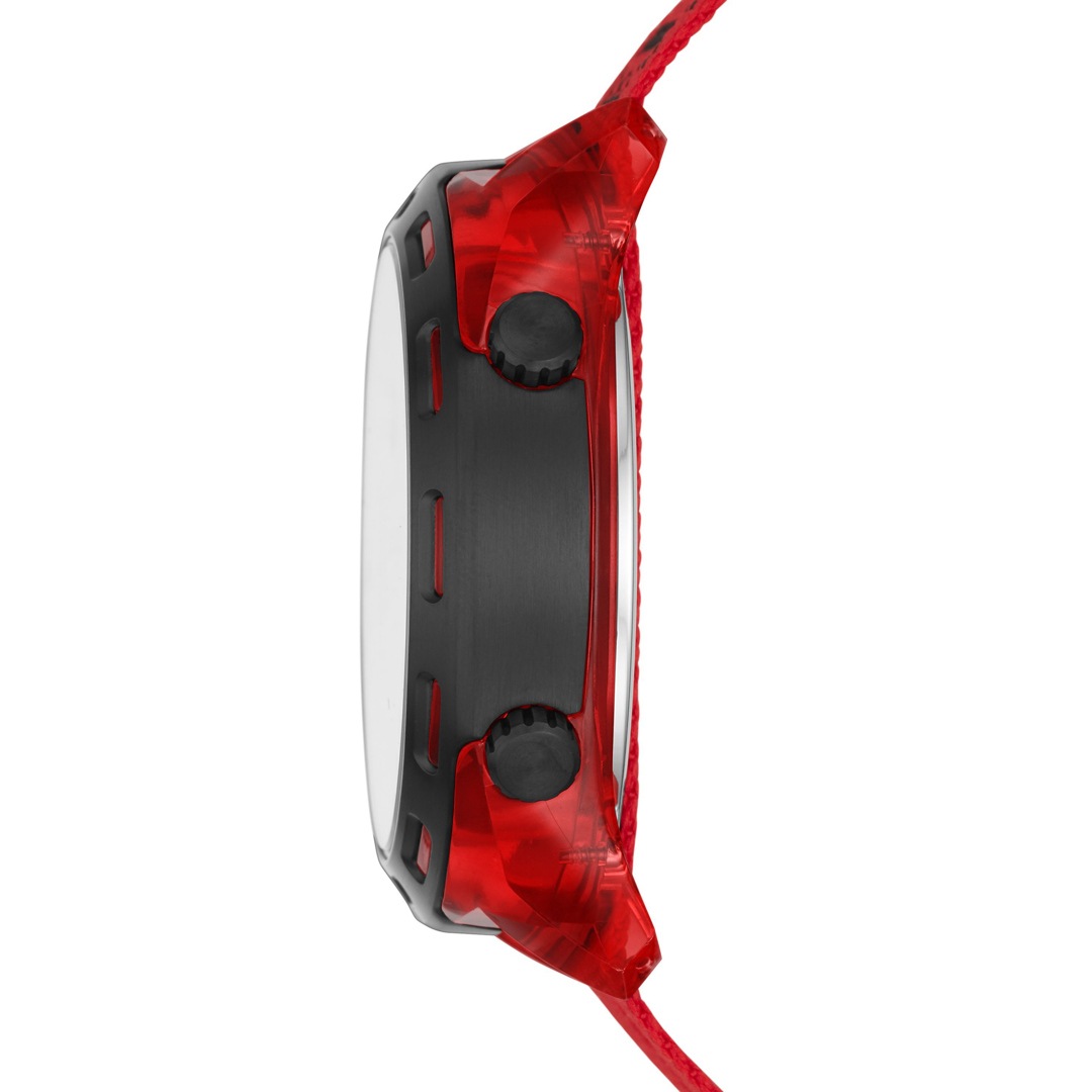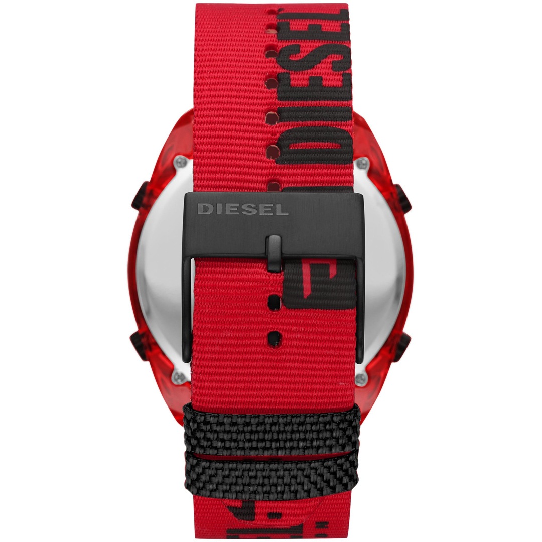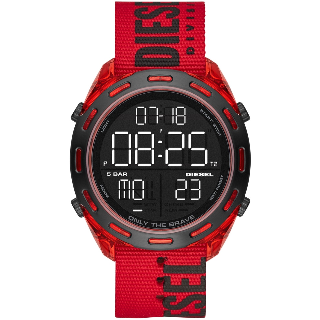 Das neue Modell Crusher von Diesel zeichnet sich durch klare Struktur und moderne Aspekte aus. Das Crusher-Uhrenmodell überzeugt mit seinem digitalen 46 mm-Ziffernblatt in mattem Schwarz, während das Armband aus rote Nylon mit einem Logodetail in Schwarz einen markanten Akzent setzt.