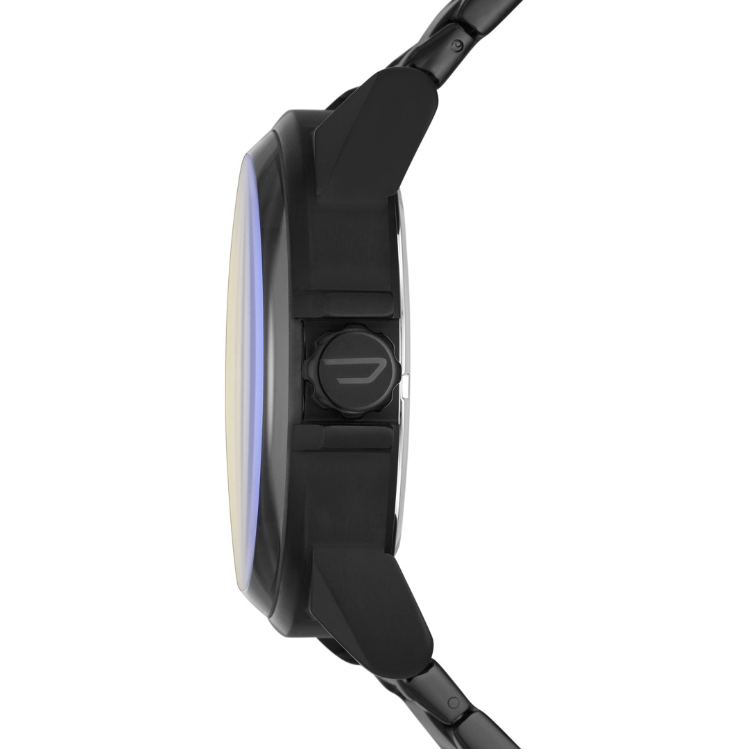 Die 48 mm D-48-Armbanduhr verfügt über ein schwarzes Ziffernblatt mit silberfarbenen stiftförmigen Indizes sowie drei Zeiger, eine irisierende Kristallglasabdeckung und ein schwarzes Edelstahlarmband.