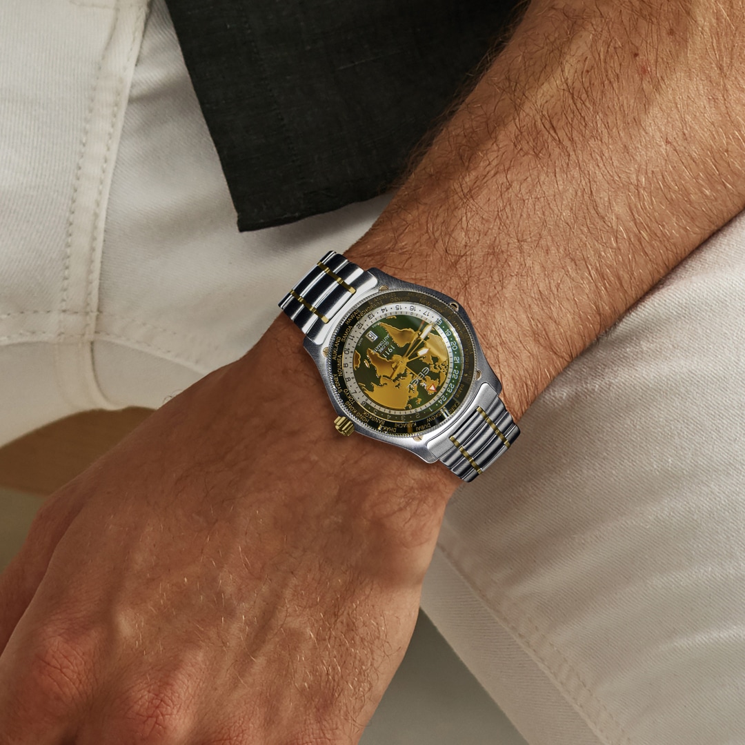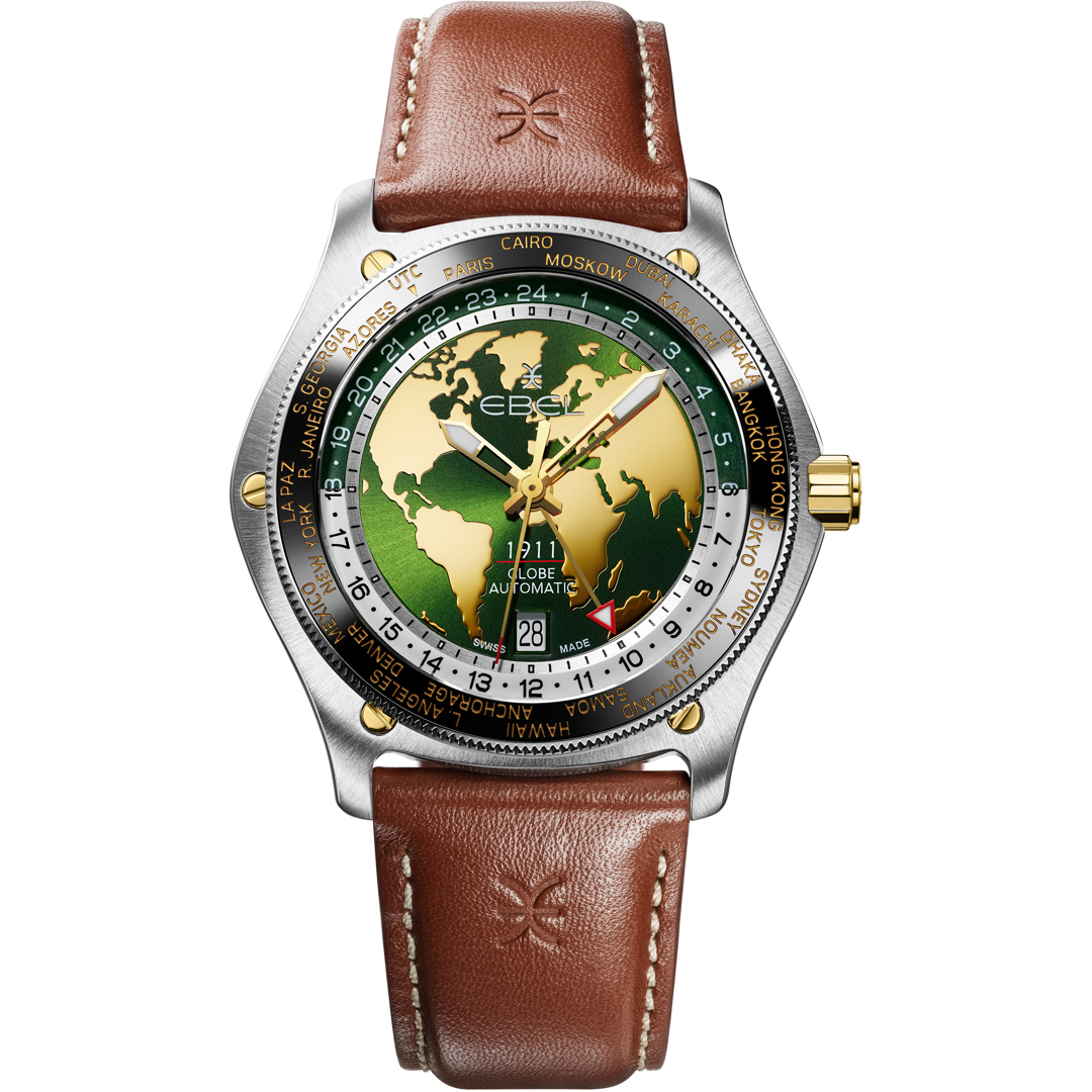Ein Zeitmesser, der die Welt in purem Luxus abbildet. Diese EBEL 1911 besticht durch ihr Gehäuse aus Edelstahl und 18K Gelbgold. Das Zifferblatt ist ein Kunstwerk: Galvanisch grüne Ozeane treffen auf erhabene, 18K vergoldete Kontinente. Angetrieben von einem Schweizer Automatikwerk mit Worldtimer-Komplikation – sichtbar durch den Saphirglasboden – zeigt die Uhr die Zeit auf der ganzen Welt. Die gravierte Keramiklünette dient als Referenz. Maximale Wandelbarkeit bieten das ikonische Bicolor-Gliederarmband und das zusätzliche, warme Kalbslederband. Ein Meisterwerk für den globalen Connaisseur.
