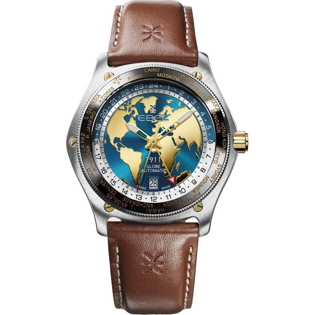 Ein Gipfel der Uhrmacherkunst für den globalen Connaisseur. Diese EBEL 1911 vereint kühlen Edelstahl mit der opulenten Wärme von 18K Gelbgold. Das Herzstück ist die komplexe Worldtimer-Funktion, angetrieben von einem Schweizer Automatikwerk und sichtbar durch den Saphirglasboden. Das Zifferblatt ist eine Landkarte des Luxus: 18K vergoldete Kontinente ruhen auf galvanisch türkisfarbenen Ozeanen. Die gravierte Lünette aus kratzfester schwarzer Keramik dient als Referenz für die 24 Zeitzonen. Dieser Zeitmesser ist ein Meister der Wandelbarkeit: Er wird mit dem ergonomischen Bicolor-Gliederarmband sowie einem warmen, braunen Kalbslederband geliefert.