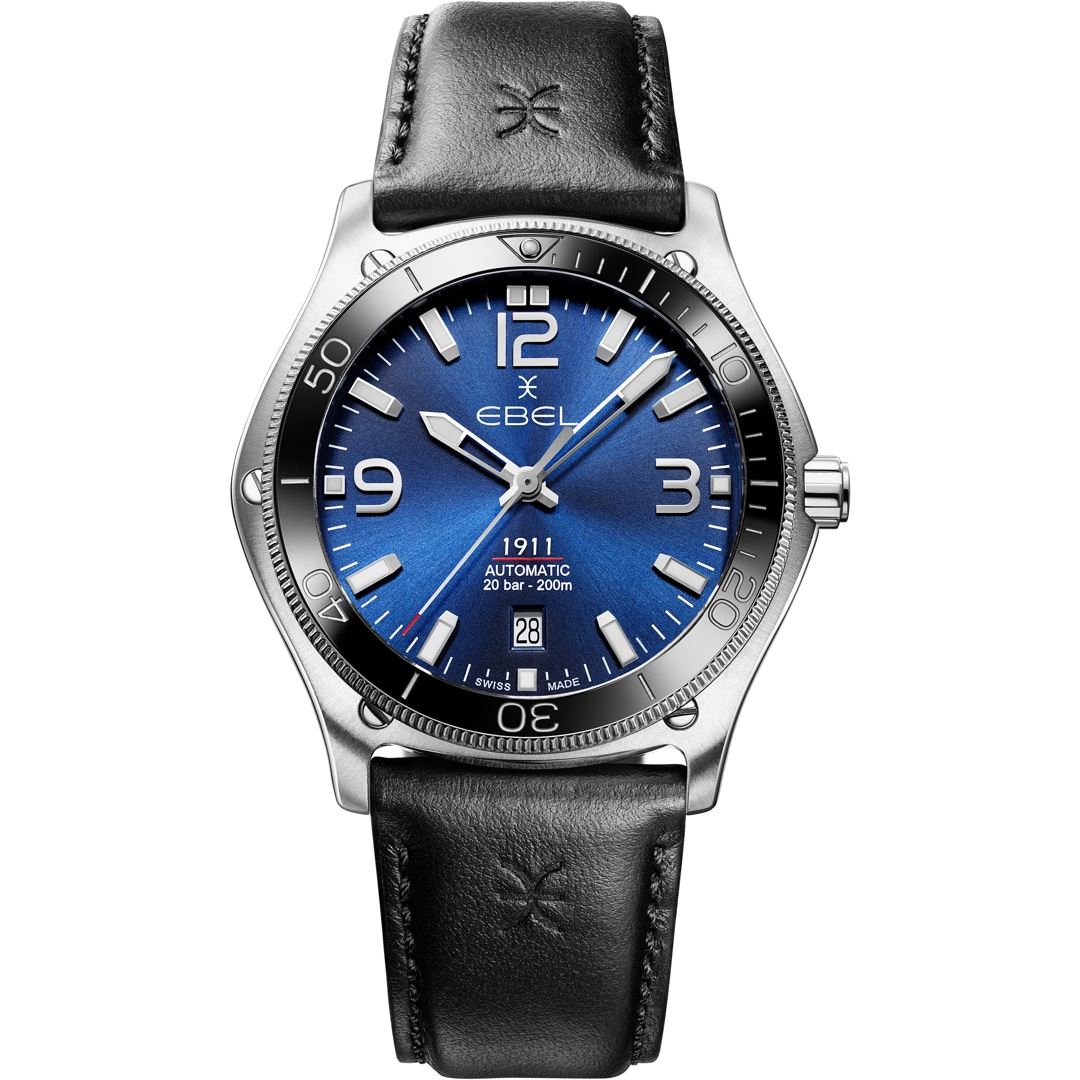 Dieser EBEL 1911 Zeitmesser ist ein Meisterwerk der Ingenieurskunst, konzipiert für höchste Ansprüche. Das 42-mm-Edelstahlgehäuse wird von einer robusten, einseitig drehbaren Lünette mit einem Ring aus kratzfester Keramik gekrönt. Das tiefblaue, galvanisierte Zifferblatt bietet unter entspiegeltem Saphirglas bei allen Bedingungen perfekte Ablesbarkeit. Im Inneren tickt ein Schweizer Automatikwerk, dessen Präzision durch den Saphirglasboden bewundert werden kann. Mit einer aussergewöhnlichen Wasserdichtigkeit von 20 bar und der Wahl zwischen dem ikonischen Gliederarmband oder einem eleganten Kalbslederband ist diese Uhr ein Statement von sportlichem Luxus und unübertroffener Vielseitigkeit.