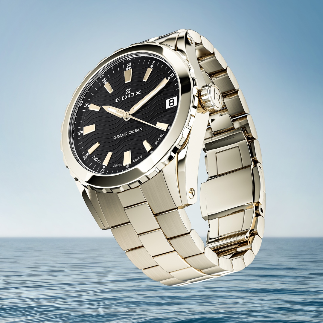 Die Edox Grand Ocean Kollektion verkörpert den kraftvollen Geist der Meere und spiegelt die tiefe Verbundenheit der Maison zu ihrem maritimen Erbe wider. Seit 1884 steht Edox als familiengeführter Schweizer Boutique-Uhrenhersteller für aussergewöhnliche Handwerkskunst und Tradition. Das neugestaltete, stromlinienförmige Gehäuse verbindet zeitlose Eleganz mit einer sportlichen Seele und sorgt für ein modernes Profil am Handgelenk. Ein markantes Highlight ist das strukturierte Zifferblatt mit Wellenmuster, das die dynamische Bewegung des Ozeans und dessen Rhythmus perfekt einfängt. Geschützt durch ein gewölbtes Saphirglas und ausgestattet mit einer verschraubten Krone, bietet der Zeitmesser eine beeindruckende Wasserdichtigkeit von bis zu 300 Metern. Dank Superluminova auf den Zeigern ist höchste Präzision in jeder Situation garantiert. Ein wahrer „Champion des Wassers“ für jeden Moment.