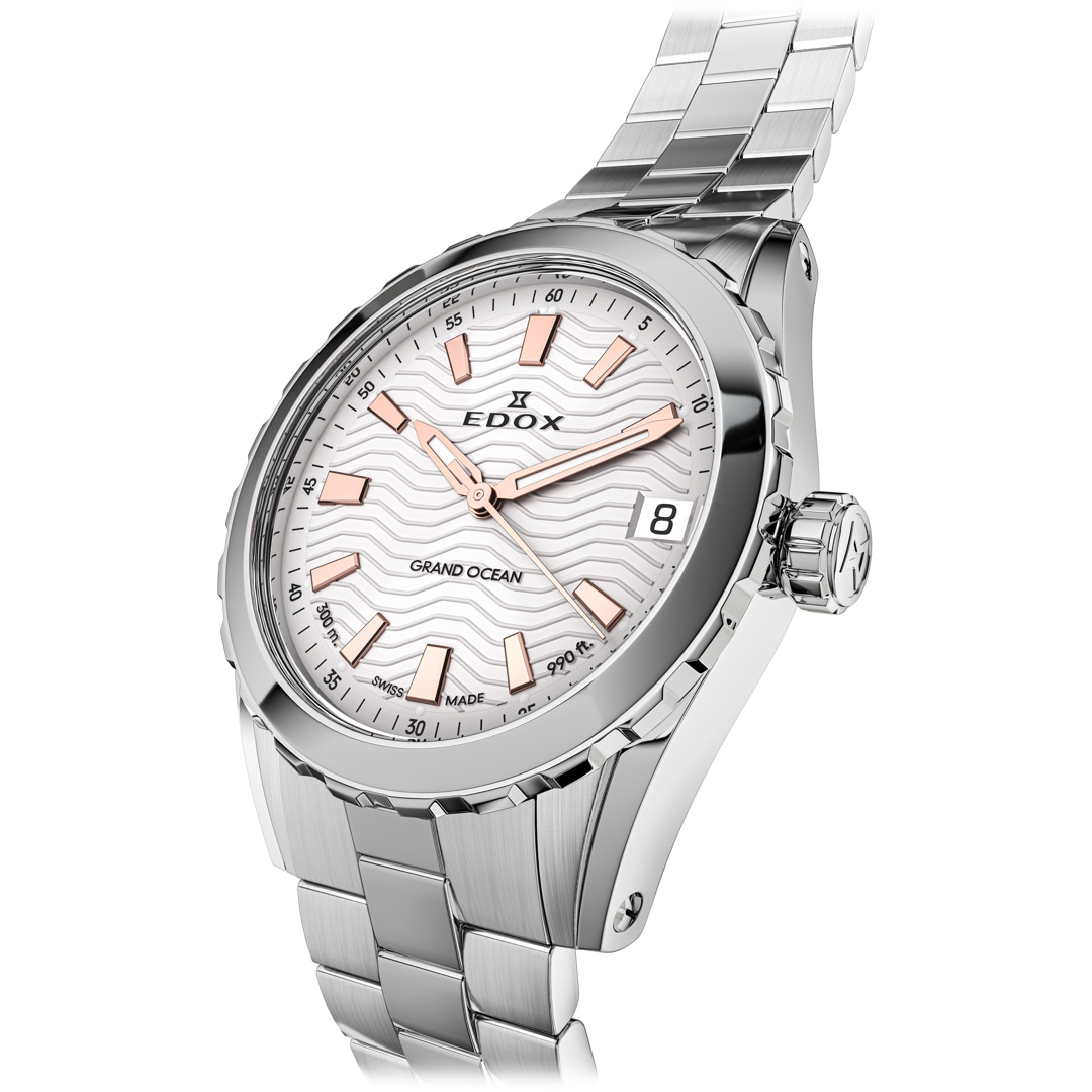 Die Edox Grand Ocean Kollektion verkörpert den kraftvollen Geist der Meere und spiegelt die tiefe Verbundenheit der Maison zu ihrem maritimen Erbe wider. Seit 1884 steht Edox als familiengeführter Schweizer Boutique-Uhrenhersteller für aussergewöhnliche Handwerkskunst und Tradition. Das neugestaltete, stromlinienförmige Gehäuse verbindet zeitlose Eleganz mit einer sportlichen Seele und sorgt für ein modernes Profil am Handgelenk. Ein markantes Highlight ist das strukturierte Zifferblatt mit Wellenmuster, das die dynamische Bewegung des Ozeans und dessen Rhythmus perfekt einfängt. Geschützt durch ein gewölbtes Saphirglas und ausgestattet mit einer verschraubten Krone, bietet der Zeitmesser eine beeindruckende Wasserdichtigkeit von bis zu 300 Metern. Dank Superluminova auf den Zeigern ist höchste Präzision in jeder Situation garantiert. Ein wahrer „Champion des Wassers“ für jeden Moment.