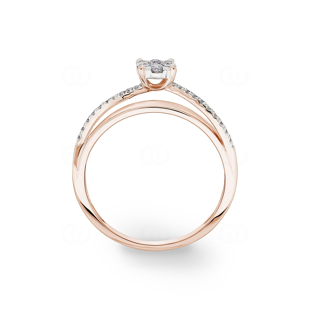 This extraordinary 18-karat rose gold ring is like a small sculpture for the hand. Its foundation lies in two sleek, high-polished gold bands that create a modern and elegant base. Rising above them, almost weightless, is a third gracefully curved band, fully set with sparkling diamonds. This luminous pathway naturally leads the eye to the radiant centerpiece: a cluster of diamonds that unfolds with the brilliance of a large solitaire.