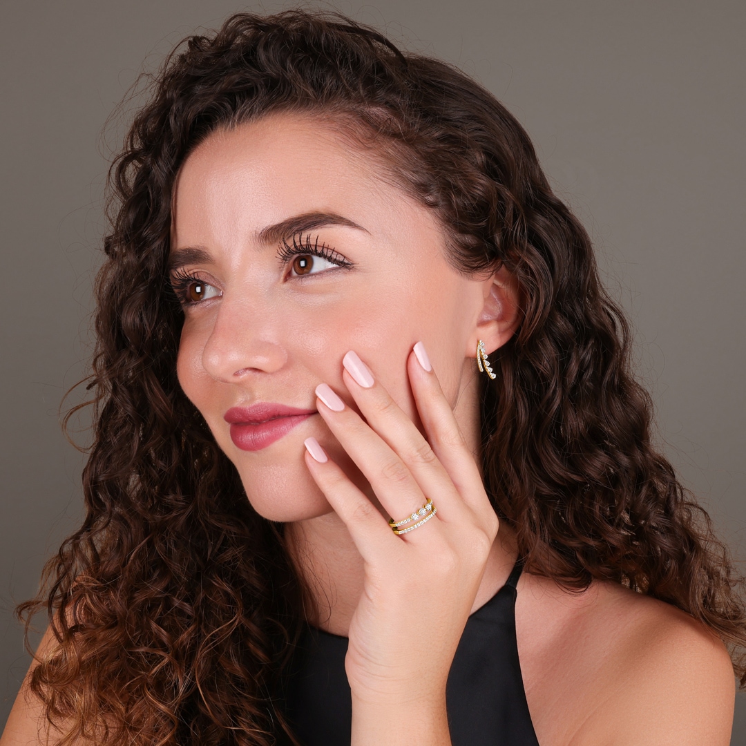 Immerse yourself in a world of timeless elegance with this stunning trilogy diamond ring in radiant yellow gold. The ring features two expertly designed bands that gracefully merge at the base and are adorned with a total of 28 sparkling diamonds, reminiscent of a mémoire ring. Yet, the true highlight lies in the three larger diamonds, majestically set in an elevated position on one of the bands. Held by a delicate 4-prong setting and resting on a faceted element, these diamonds shimmer intensely, reflecting light in a magical dance that enhances their appearance. This ring symbolises pure love and eternal beauty, elevating every wearer into a realm of glamour and splendour.