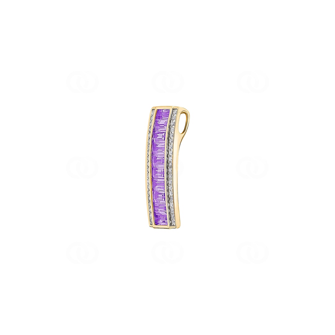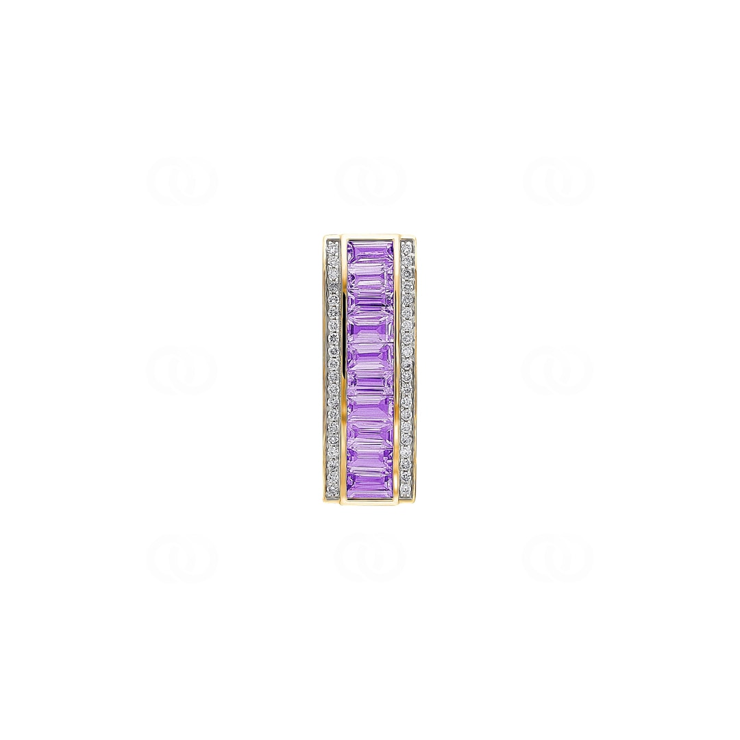 This 18-karat yellow gold pendant combines the geometric clarity of Art Deco style with an opulent and expressive use of colour. At the heart of the design runs a continuous row of ten baguette-cut amethysts, whose deep, rich purple gives the piece remarkable depth and an aura of pure luxury. Framing this bold line of colour are two rows of diamonds, 40 in total, whose bright fire creates a stunning contrast and makes the violet shine even more intensely.
