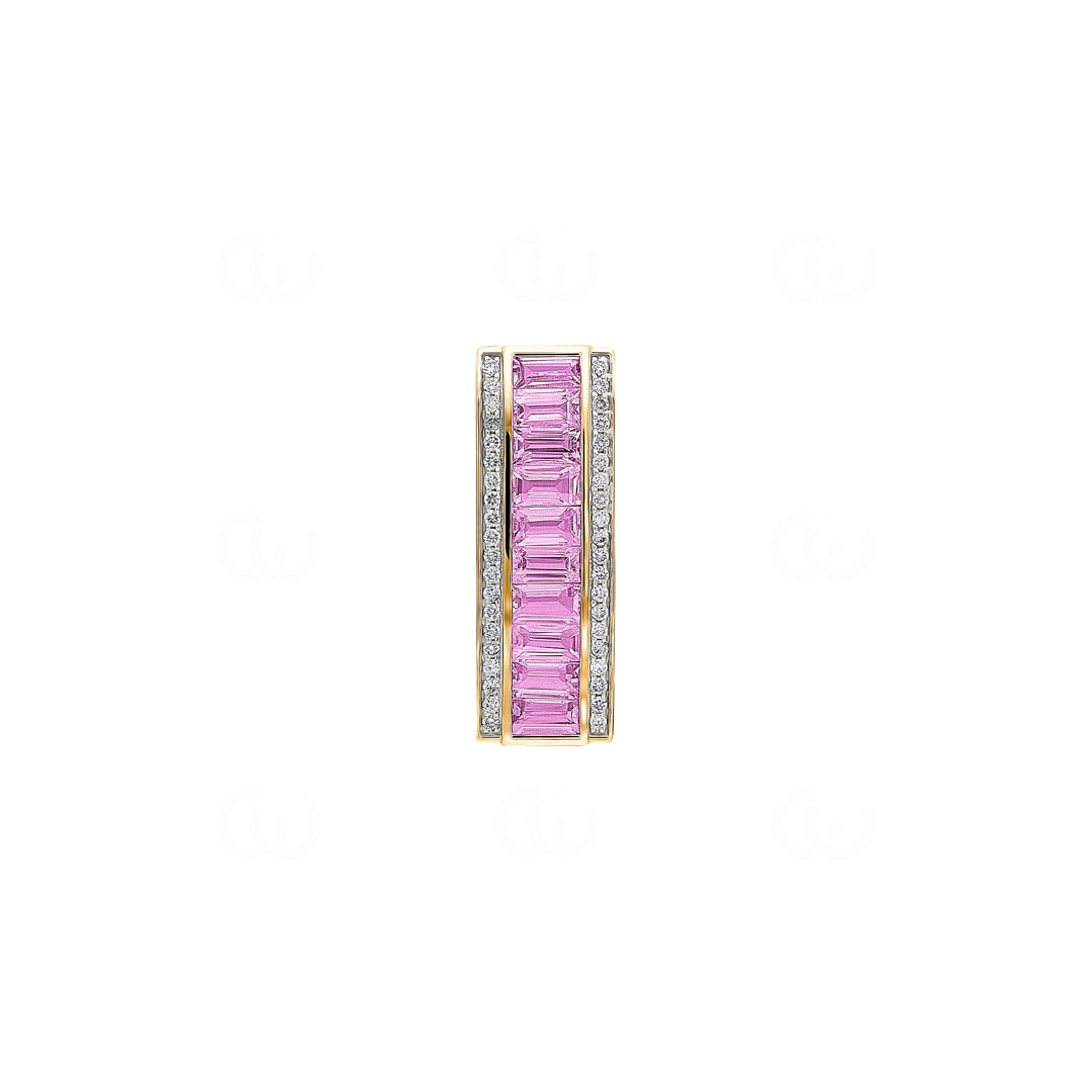 This 18-karat yellow gold pendant is a statement of refined luxury and modern femininity. Its architectural design makes it a bold and stylish expression. At the heart of the piece lies a continuous row of ten baguette-cut pink sapphires, whose vibrant and luminous hue immediately captures attention. Their vivid colour infuses the pendant with both strength and feminine elegance. Framing this radiant line are two rows of diamonds - 40 in total - whose sparkling brilliance enhances the design with a glamorous allure.
