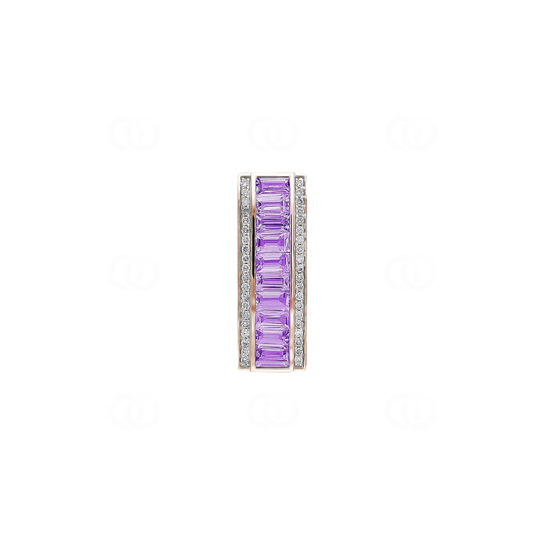 This 18-karat rose gold pendant combines the geometric clarity of Art Deco style with an opulent and expressive use of colour. At the heart of the design runs a continuous row of ten baguette-cut amethysts, whose deep, rich purple gives the piece remarkable depth and an aura of pure luxury. Framing this bold line of colour are two rows of diamonds, 40 in total, whose bright fire creates a stunning contrast and makes the violet shine even more intensely.