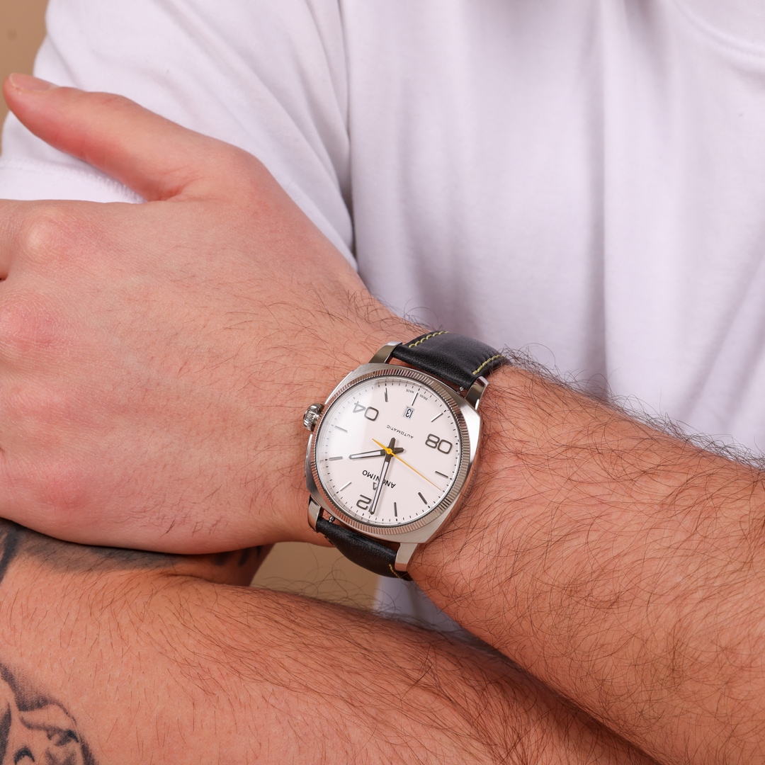 This Anonimo Epurato model comes in various finishes. Its proportions are perfect even for larger wrists. The case shape is original, slightly vintage, and brilliantly shiny. Its thickness is minimal, and the watch slips easily under a shirt cuff. The model with the white dial and blue hands doesn't quite match the images, which don't really do it justice. It looks matte, but it's actually more of a moiré effect. The color isn't truly white either; it could be described as pearly (or pearl-colored), or even coffee cream. In any case, it's very original and gives the watch a striking style, making it much less understated than its matte-dial counterparts. The leather strap has been crafted to give it an equally unique look. In short, a beautiful watch that stands out from the crowd and is quite surprising without being flashy. Give it a try!