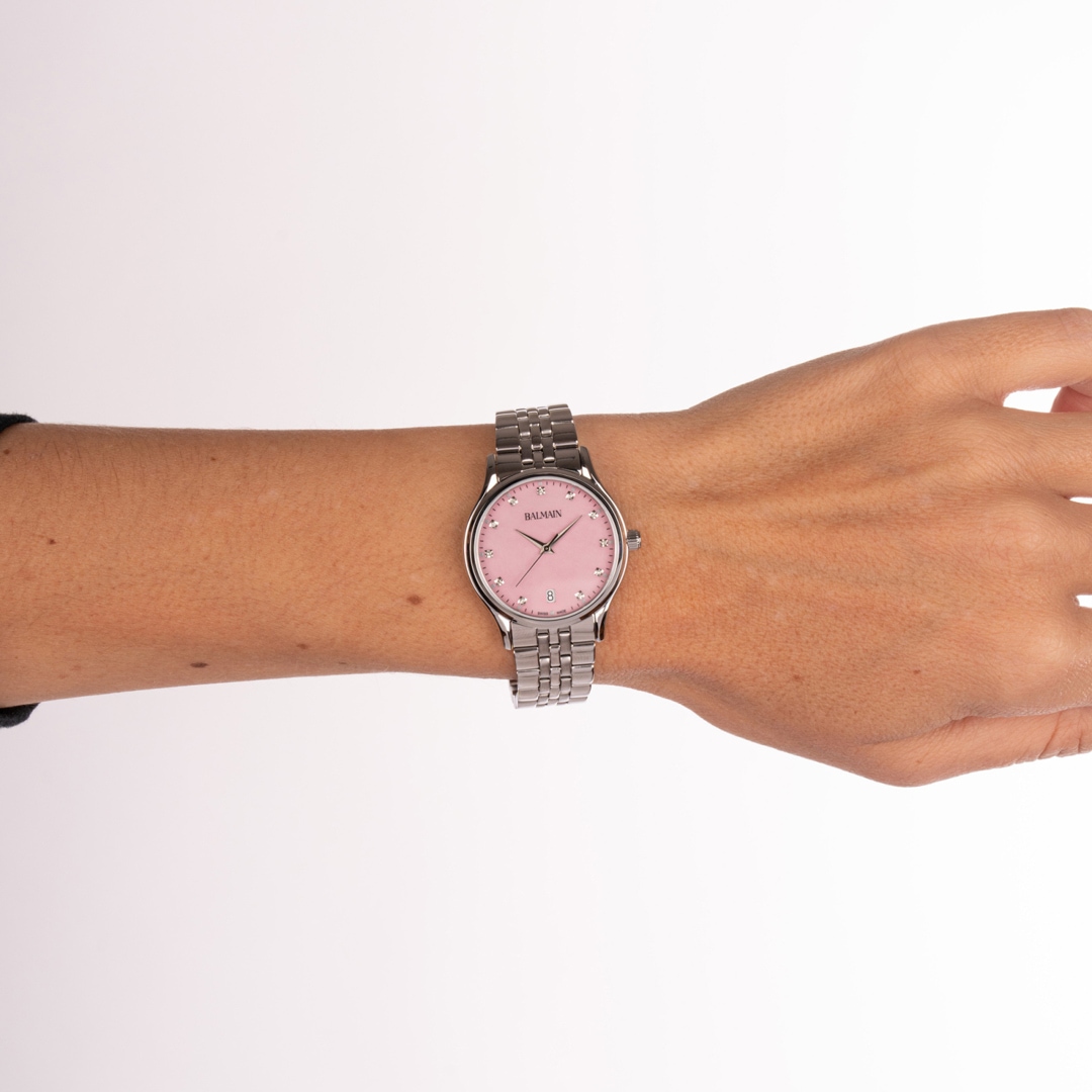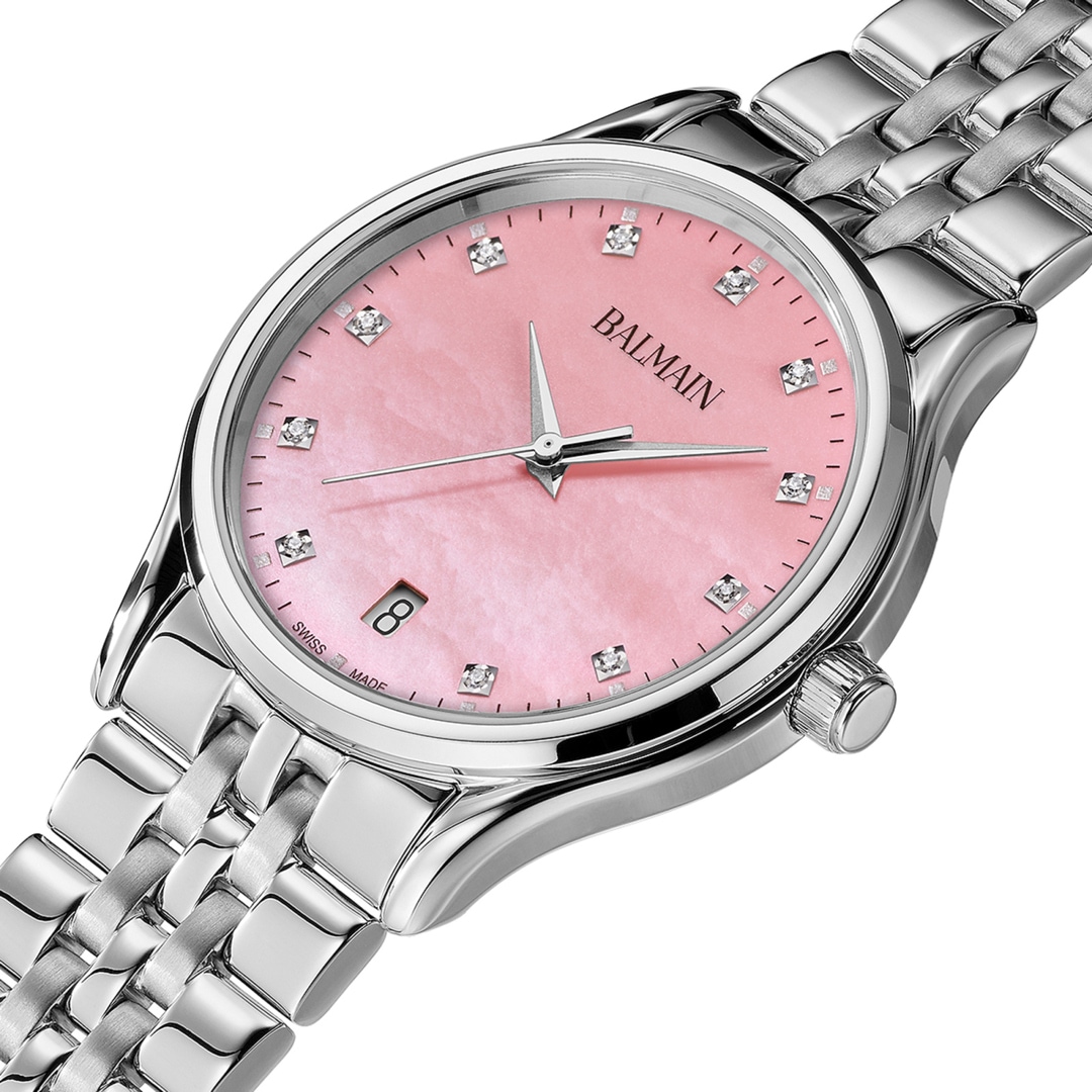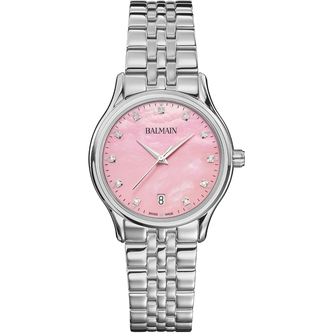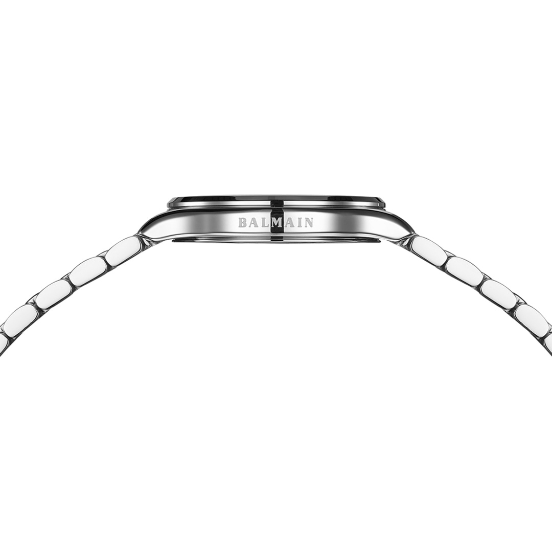 Balmain watches, bearing the prestigious Swiss Made label, are manufactured in Saint-Imier, the birthplace of traditional watchmaking in the heart of the Jura. All Balmain watches fulfil the same strict quality criteria: They are available in inexpensive stainless steel versions, elaborate gold or rose-coloured PVD coatings through to extravagant embellishments with diamonds. Every detail is perfectly crafted to fit the red carpet of the stars or the city pavement, complementing today's dynamic male and female lifestyles. The decoration with arabesques is a characteristic accent in the design of the timepieces. Balmain watches are committed to carrying the tradition of customised time into the future. Swiss watchmaking expertise and innovation have resulted in collections that accurately reflect the sophistication and allure of haute couture. Bold, attractive shapes characterise the signature of the watches. The history of the watch brand includes a series of premieres and sensational designs. In the 1990s, Balmain used diamond settings in steel watch cases in an unprecedented way. In 1998, the Chronolady presented the world's smallest chronograph for a ladies' watch.